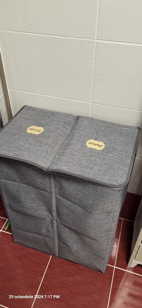 2 compartimente cu saci detasabili. Sortati rufele fara probleme cu acest cos dublu de rufe, de fiecare data cand va schimbati. Cei 2 saci detasabili cu manere sunt usor de scos fara a muta intregul cos. Luati doar sacii si plecati!