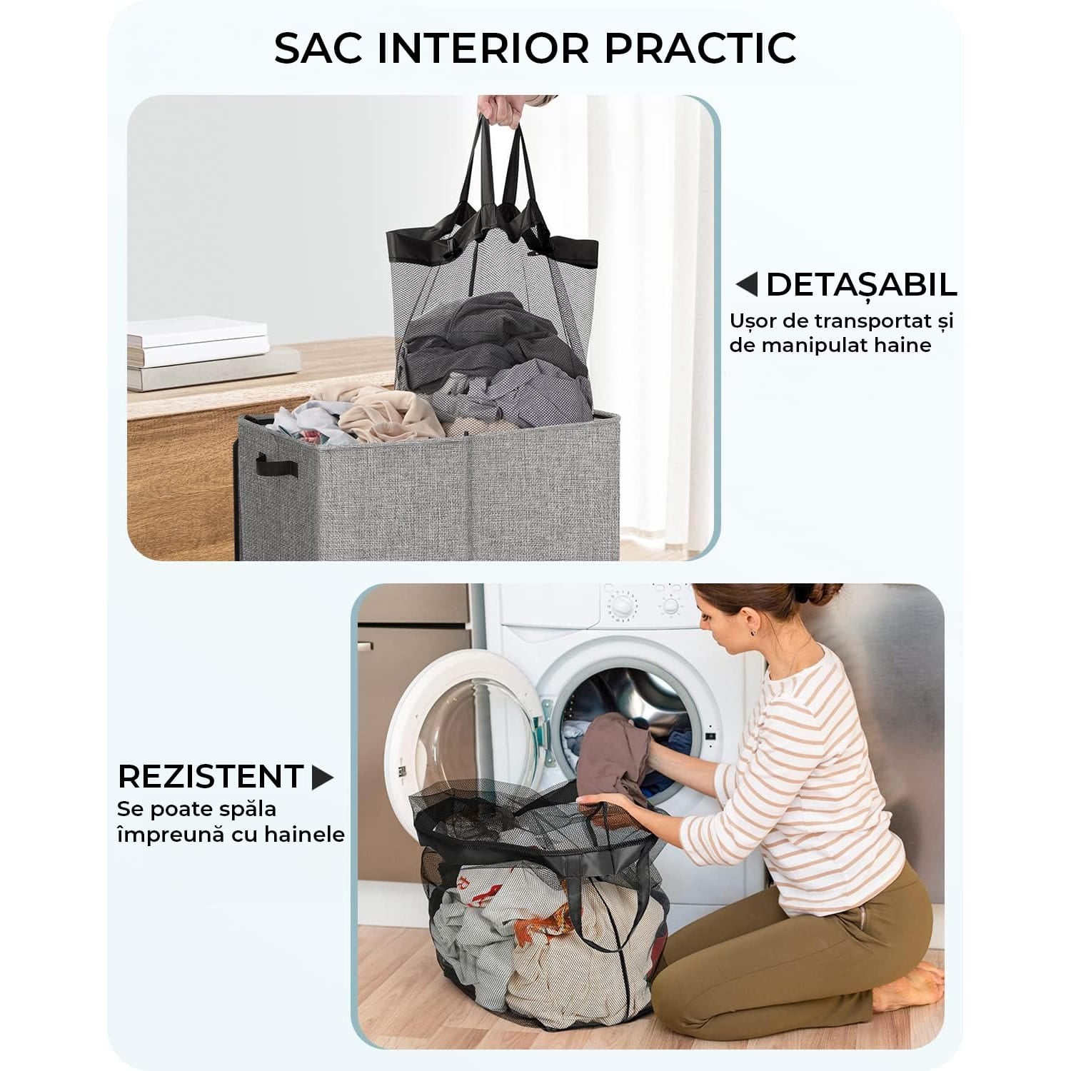 Capac si Sac Detasabil: Capacul mentine hainele murdare in afara vederii, oferindu-va un mediu ordonat. Echipat cu 2 saci interiori detasabili, puteti scoate hainele fara a muta intregul cos de rufe si puteti transporta hainele la masina de spalat cu usurinta cu acesti saci interiori.