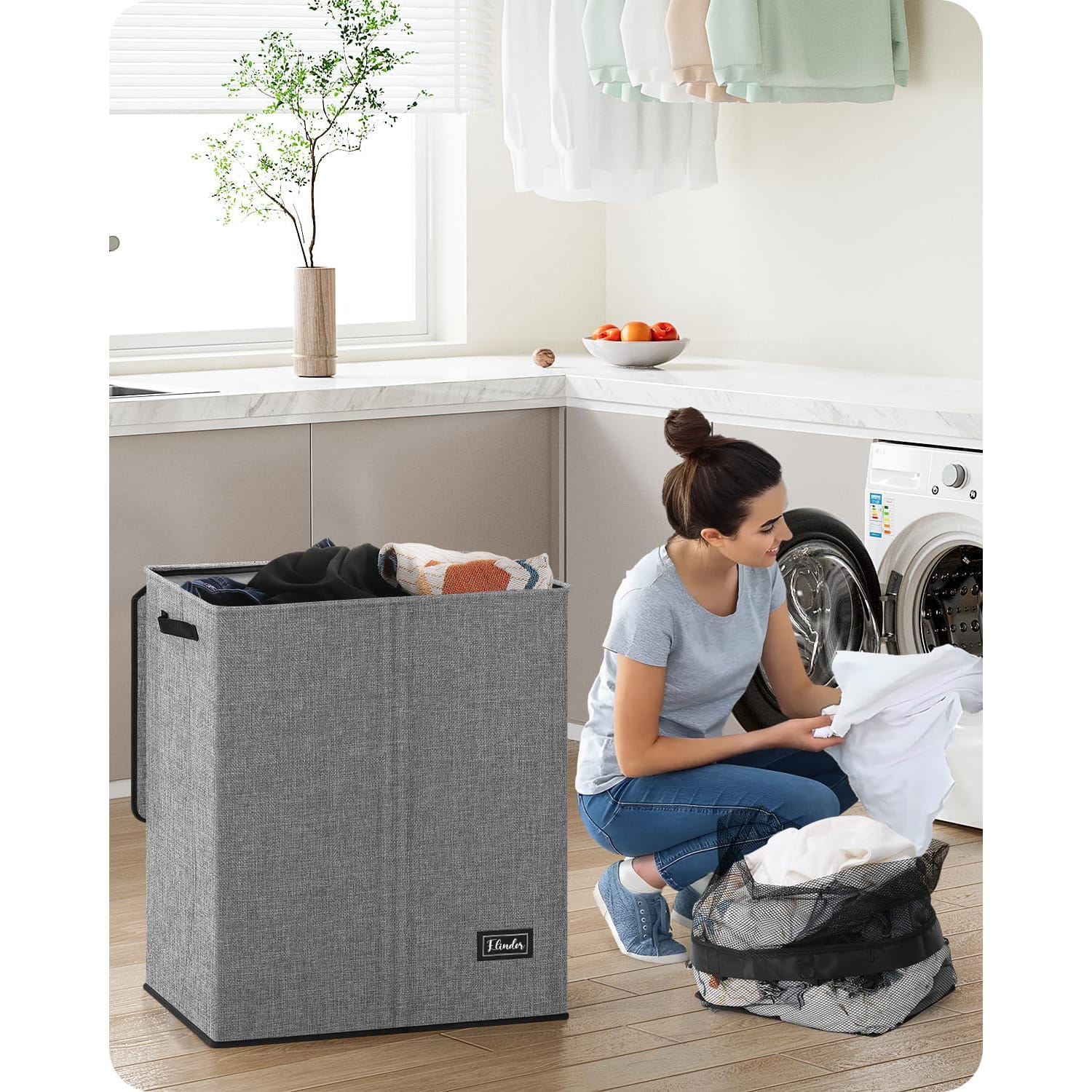 Cos de Rufe cu 2 Compartimente: Cosul de rufe dublu are dimensiunile de 57×38×67 cm, cu o capacitate mare de 145L pentru sortarea rufelor saptamanale. Capacitatea mare de 145L este suficienta pentru a stoca hainele tuturor membrilor familiei sau jucariile copiilor. Potrivit pentru persoane singure, cupluri, parinti si o alegere buna in viata de familie.