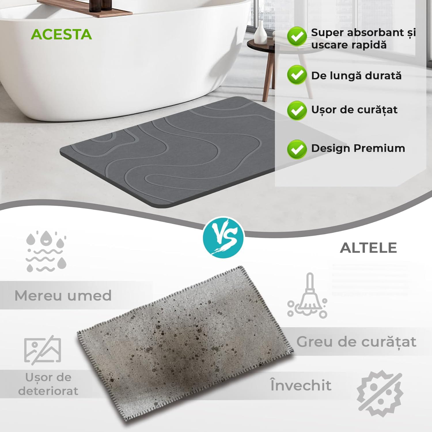 Materiale Sustenabile: Covorul de baie este fabricat 100% din diatomit, fiind sigur, ecologic si cu o durata de viata mai lunga decat covorasele traditionale. Pe termen lung, reprezinta o alegere economica.