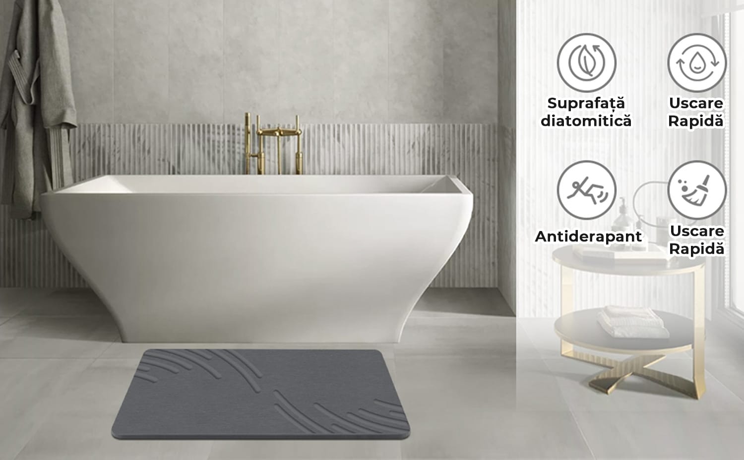 Materiale Sustenabile: Covorul de baie este fabricat 100% din diatomit, fiind sigur, ecologic si cu o durata de viata mai lunga decat covorasele traditionale. Pe termen lung, reprezinta o alegere economica.