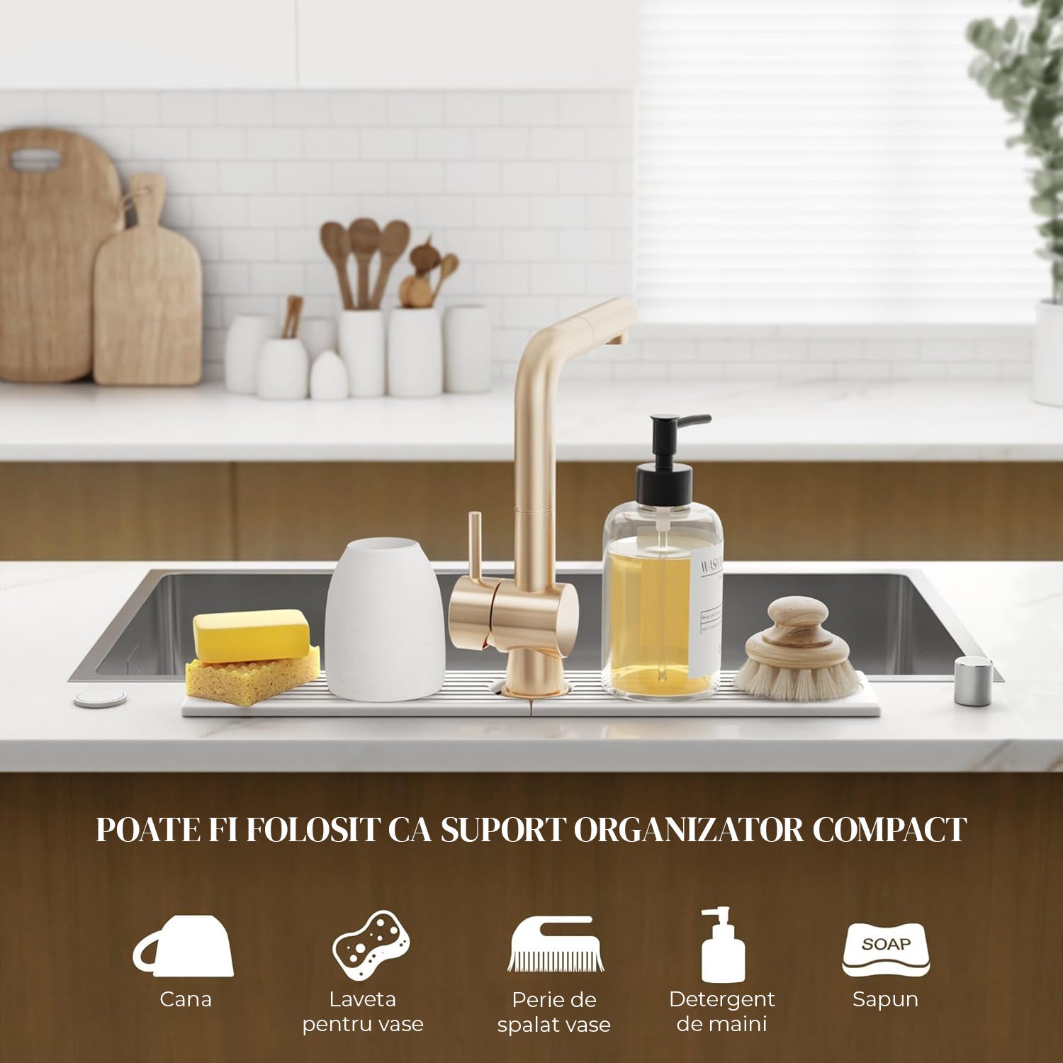 • Menține curățenia – ideală ca suport absorbant pentru săpun, bureți, dozatoare, pahare, loțiuni sau alte accesorii, păstrând blatul uscat și ordonat.