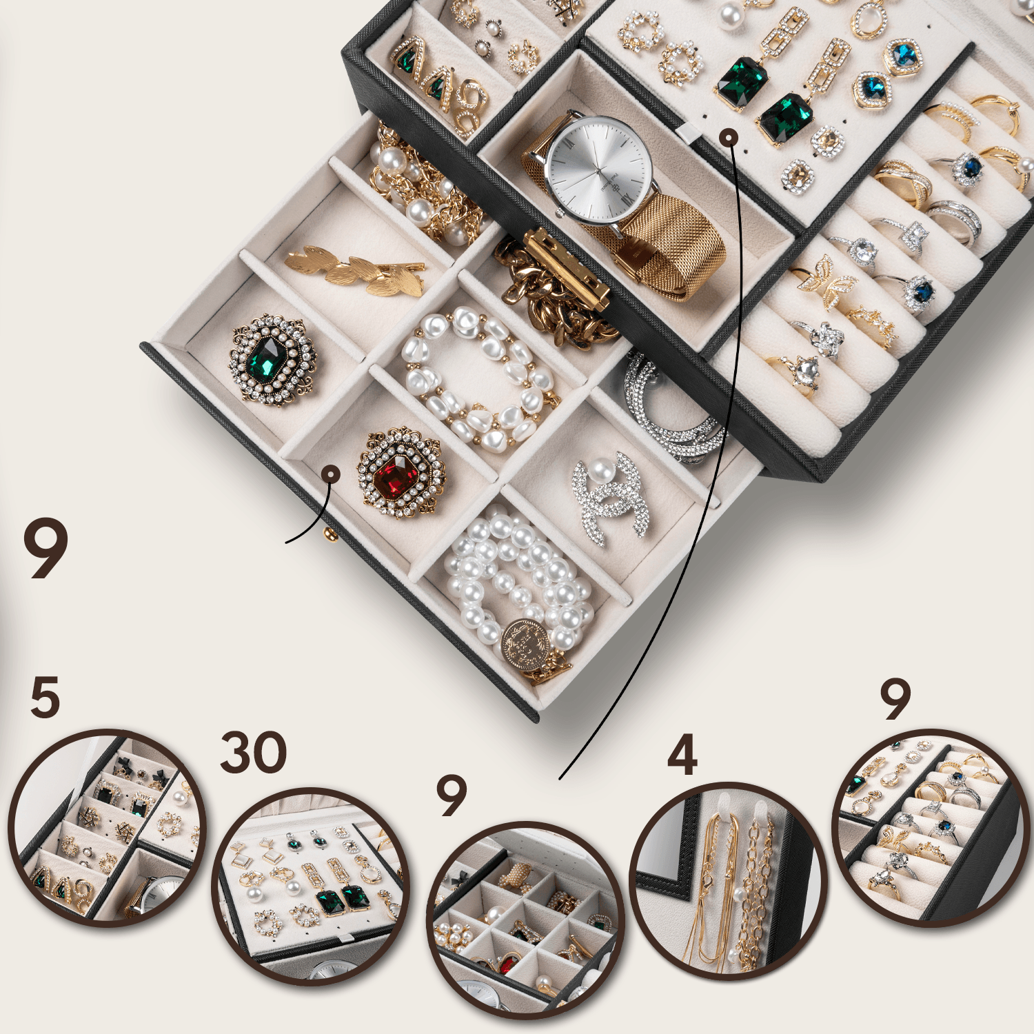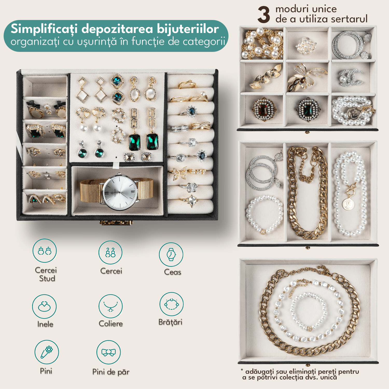 PREZINTĂ CU MANDRIE BIJUTERIILE TALE ORGANIZATE. Pierderea cerceilor, brățărilor, inelelor și descalcirea colierului este enervantă. Economisiți timp in găsirea bijuteriei care se potrivește cu look-ul dvs. uimitor! Nu vă ascundeți bijuteriile! Expuneți-le cu stil cu ajutorul casetei noastre de bijuterii rafinate și la modă.