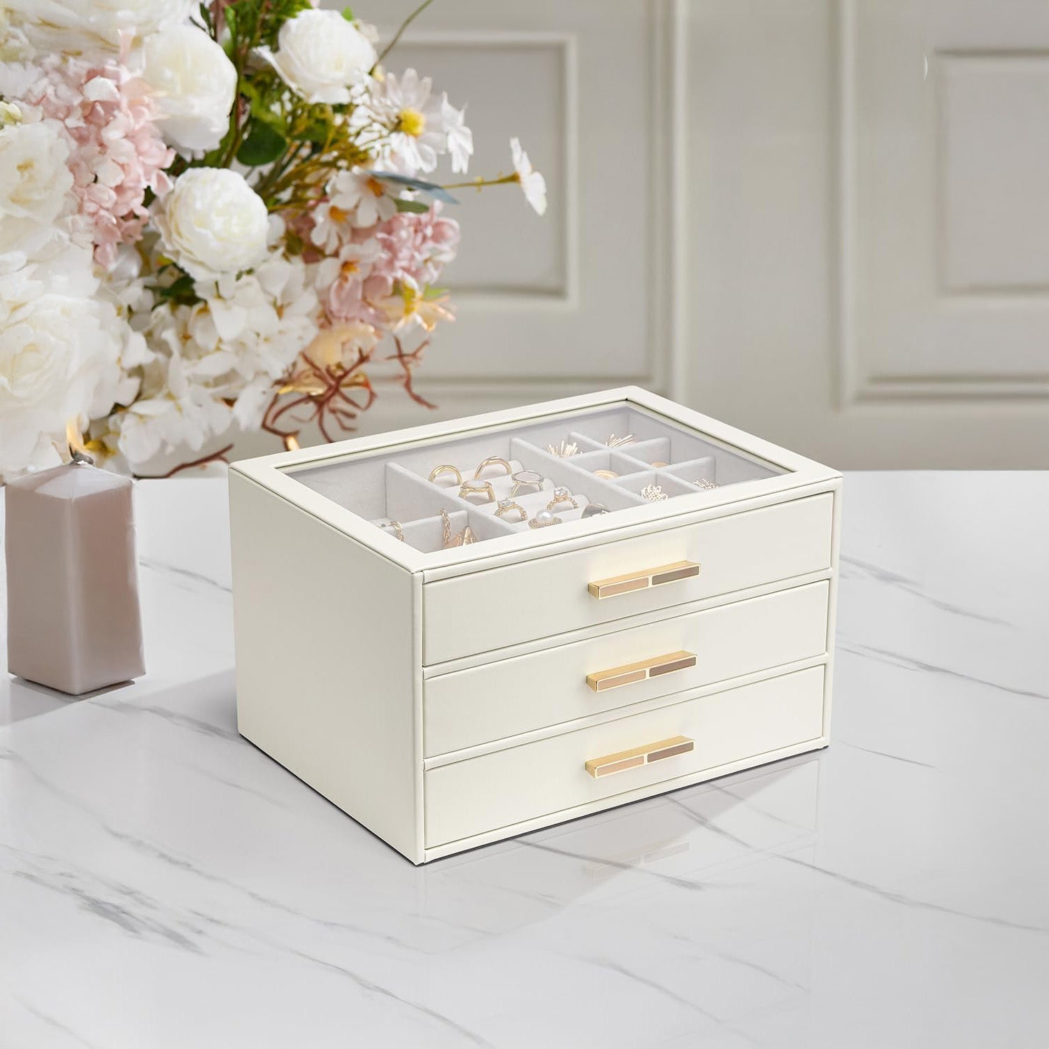 Cutie de Bijuterii Elindor® 3 Sertare si Geam Transparent, Organizator Elegant Pentru Inele, Cercei, Bratari Si Coliere, Design Modern, Alb