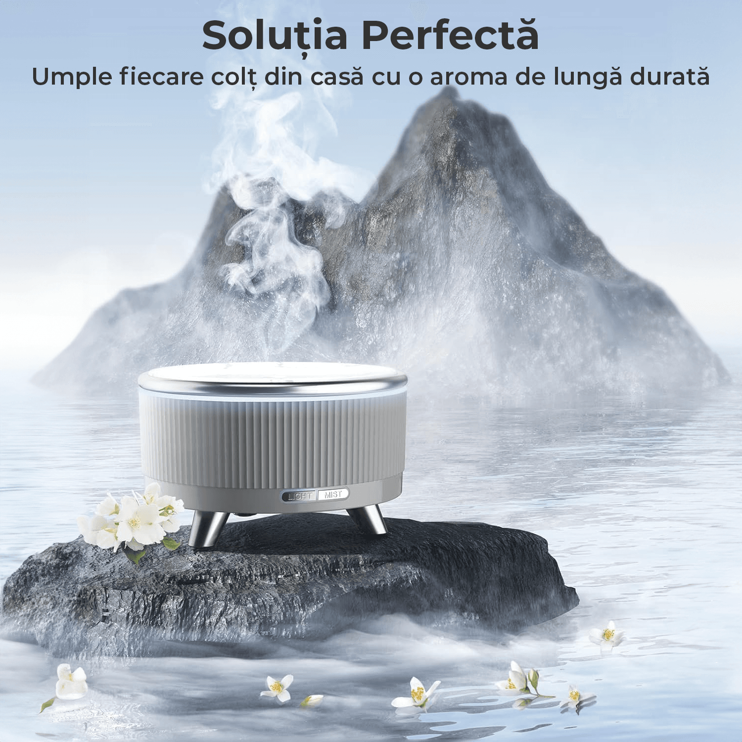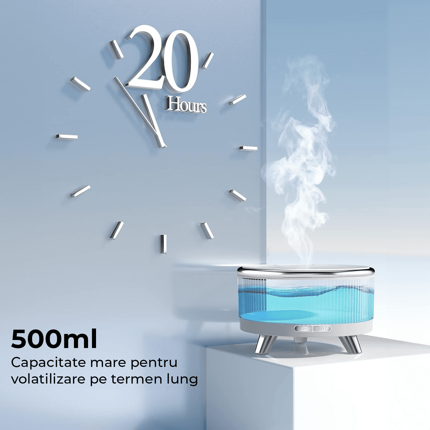 Difuzor de 500ml, Ideal pentru Camere Mari: Aria de acoperire ajunge pana la 45 m², fiind potrivit pentru utilizare in camere mari. Bucura-te de pana la 20 de ore de aroma. Exista trei setari de timp disponibile: 1/3/6 ore.