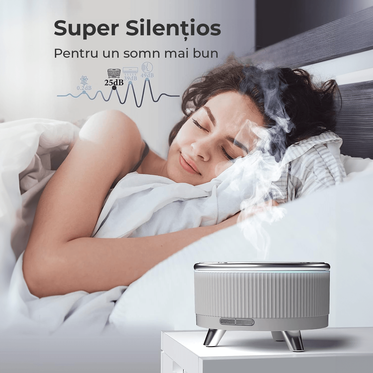 Zgomot Redus: Adoptand tehnologia de reducere a zgomotului, difuzorul ultrasonic functioneaza in liniste, fara sunete de picurare a apei, creand un mediu linistit si relaxant pentru odihna, munca si somn linistit.