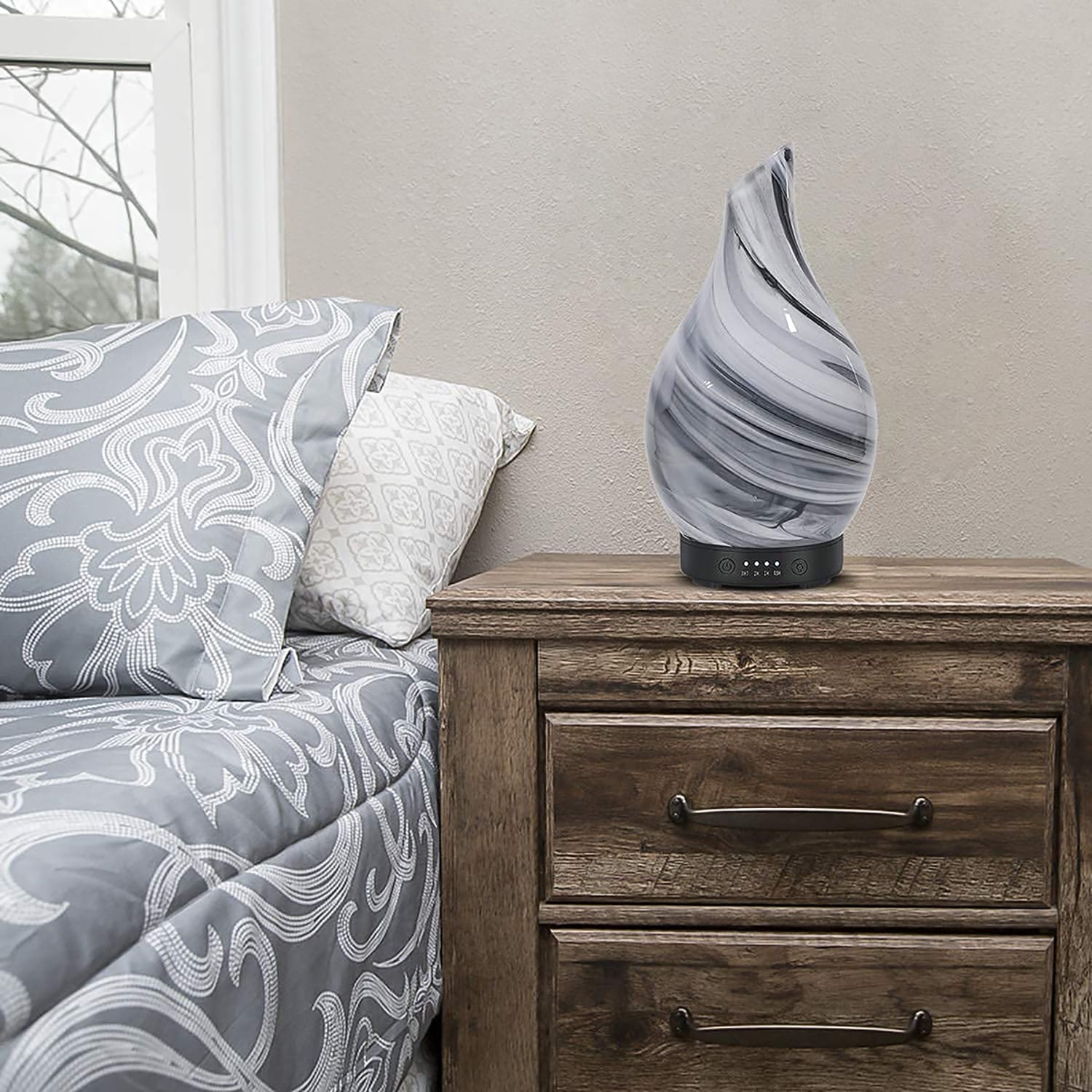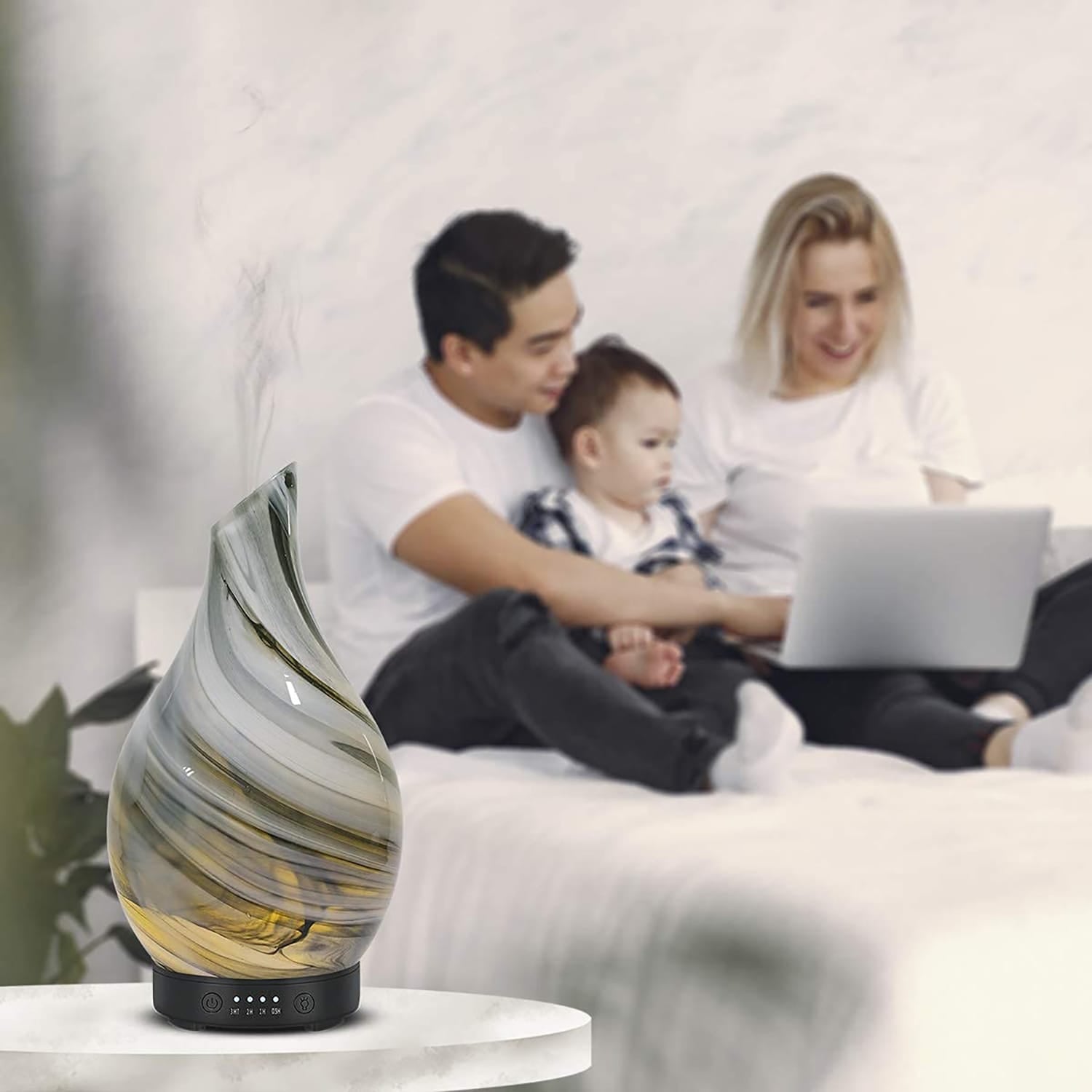 Design Unic: Capac din sticla, design cu pictura in cerneala, o adaugare perfecta in orice casa contemporana, birou, sala de sport, spa sau studio. Compact si portabil, capacul difuzorului de uleiuri esentiale se poate indeparta fara efort, usor de umplut cu apa si cateva picaturi de ulei esential.