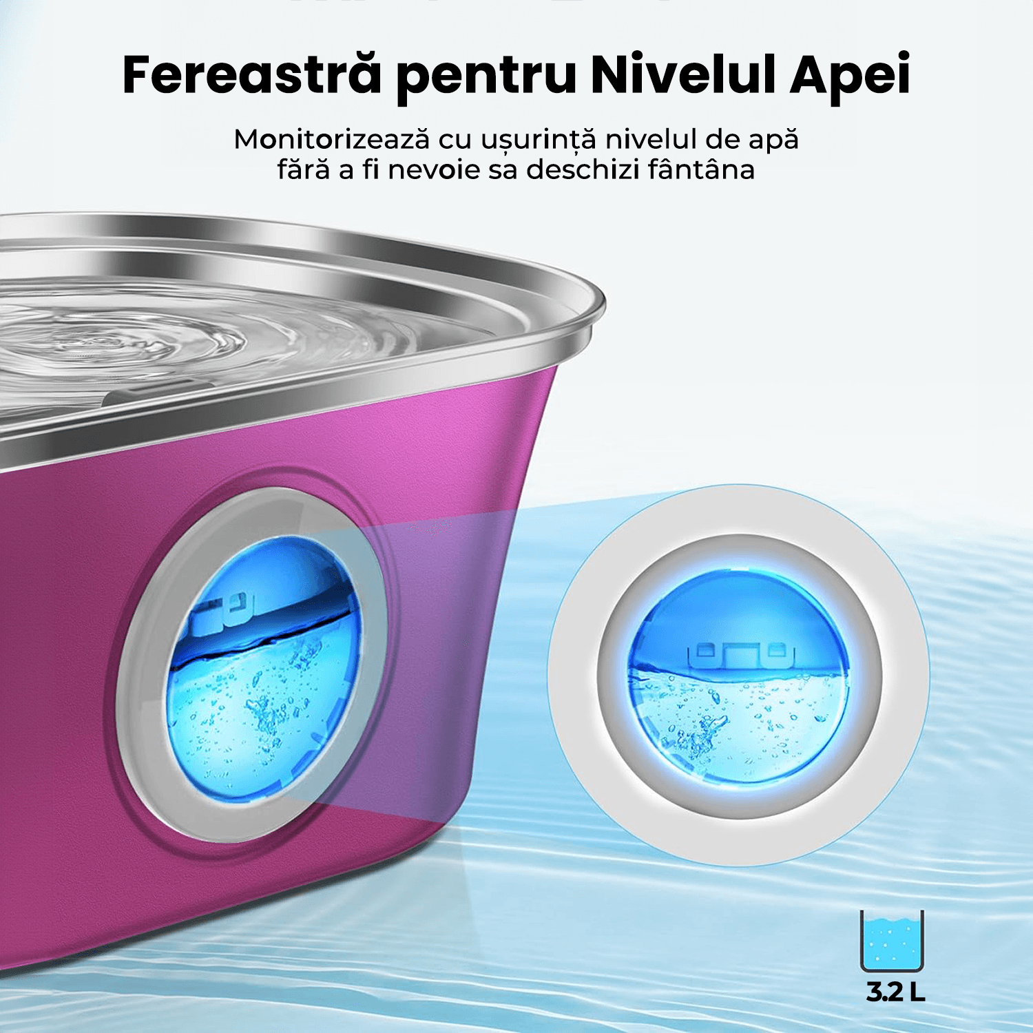 Dispune de o fereastra transparenta pentru nivelul apei, permitandu-ti sa monitorizezi cu usurinta nivelul de apa fara a fi nevoie sa deschizi fantana. Aceasta caracteristica unica economiseste timpul si efortul tau.