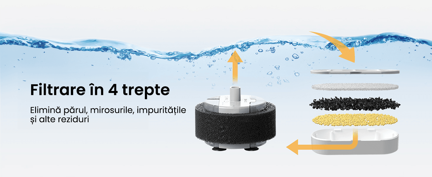 Echipata cu un sistem de filtrare si burete pre-filtrant, fantana elimina parul si alte reziduri, eliminand mirosurile si impuritatile, oferind astfel animalelor tale apa curata si purificata.