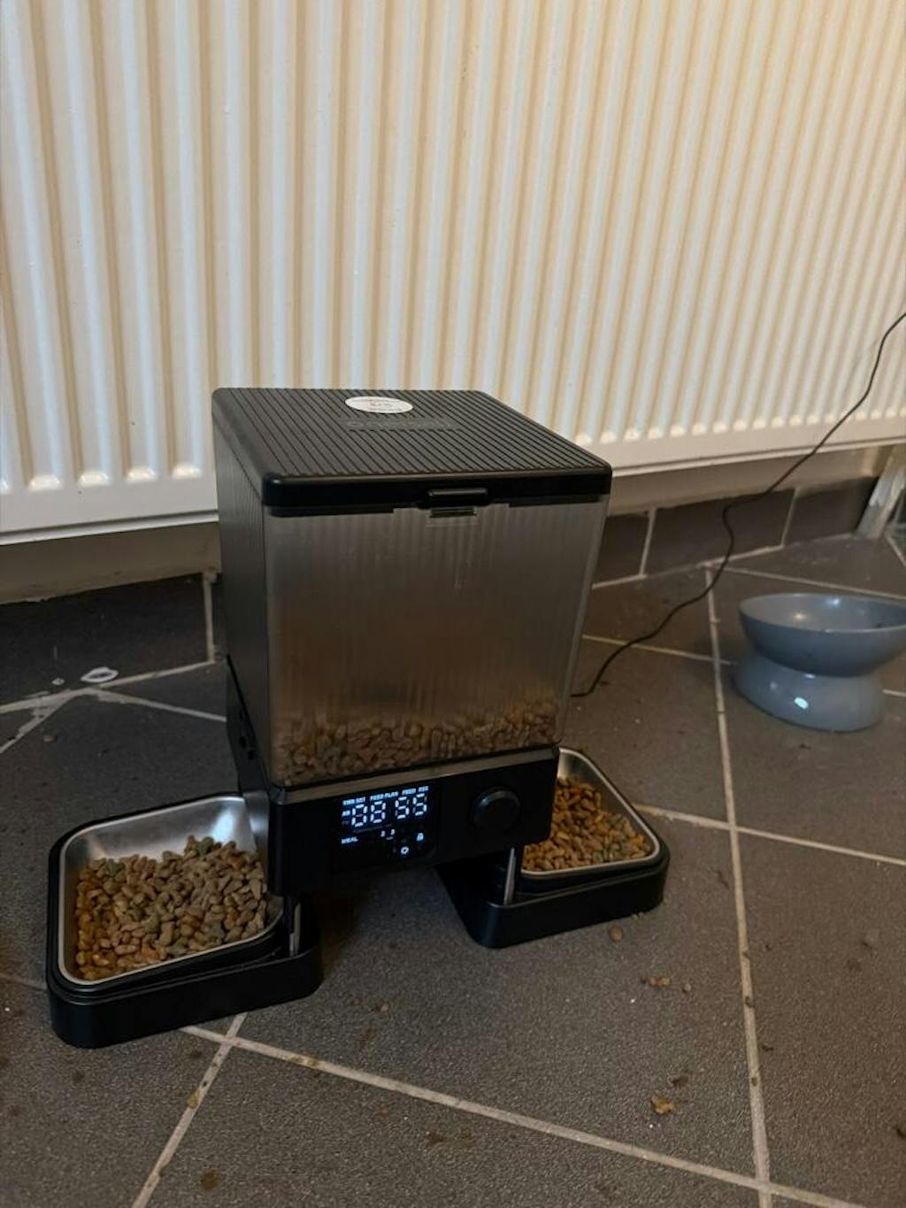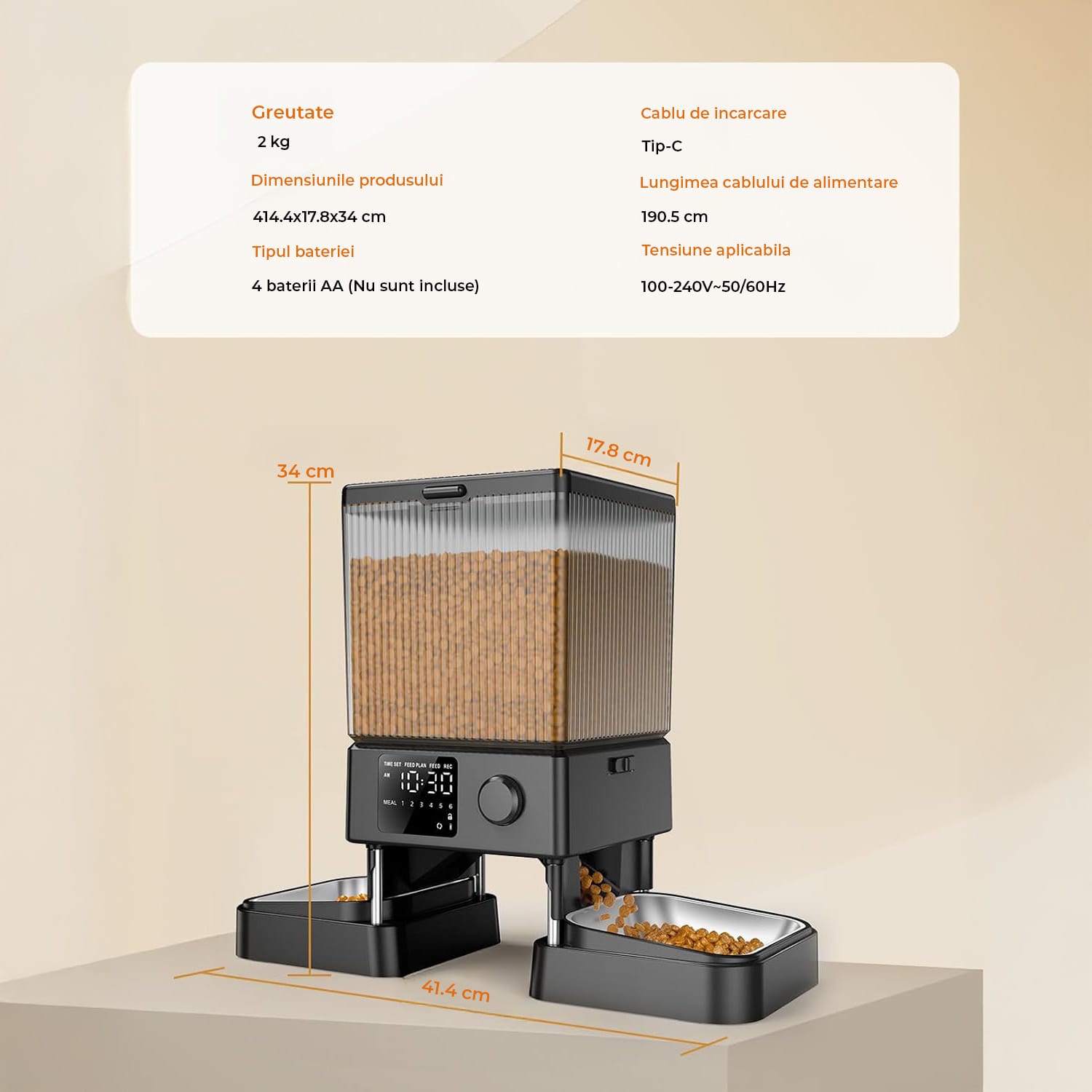 Fiecare portie distribuita are aproximativ 10 grame, cu dimensiunea boabelor mai mica de 1.27 cm. Hranitorul ofera posibilitatea de a programa pana la 6 mese pe zi, astfel incat fiecare bol sa primeasca portia exacta necesara pentru o dieta sanatoasa.