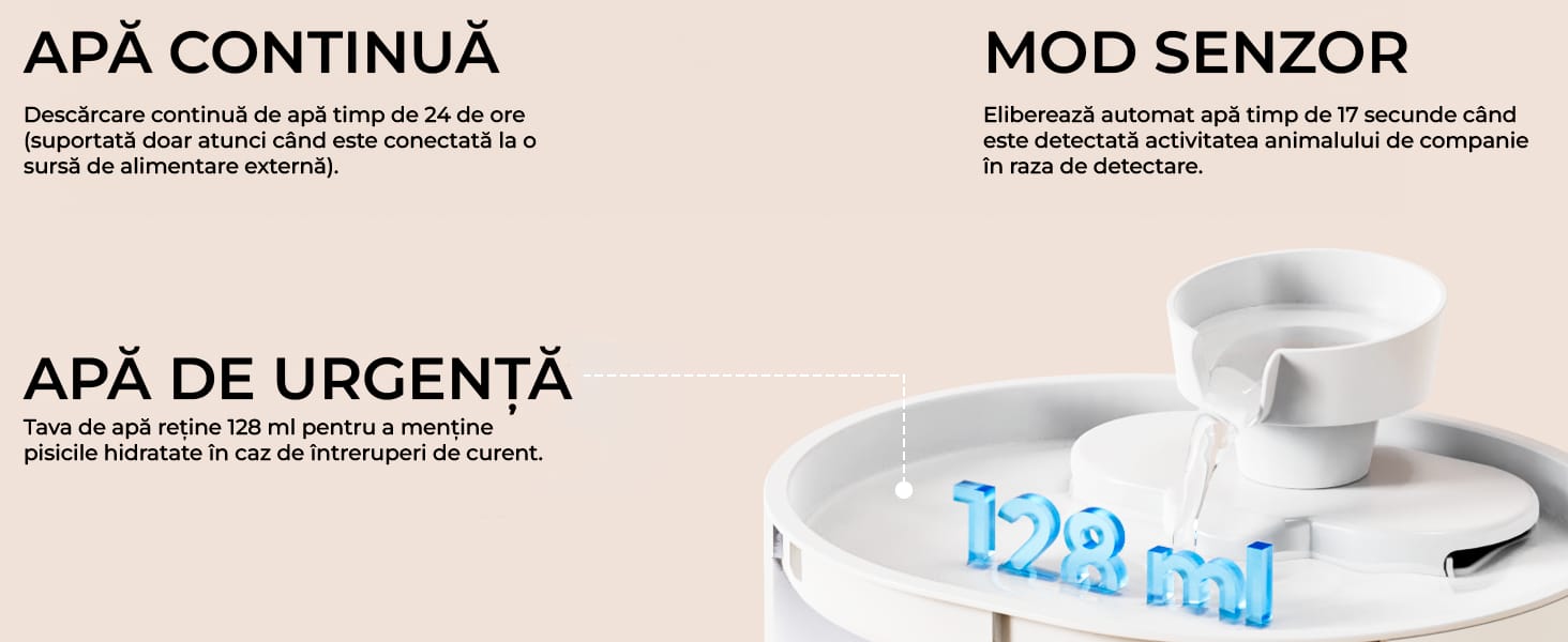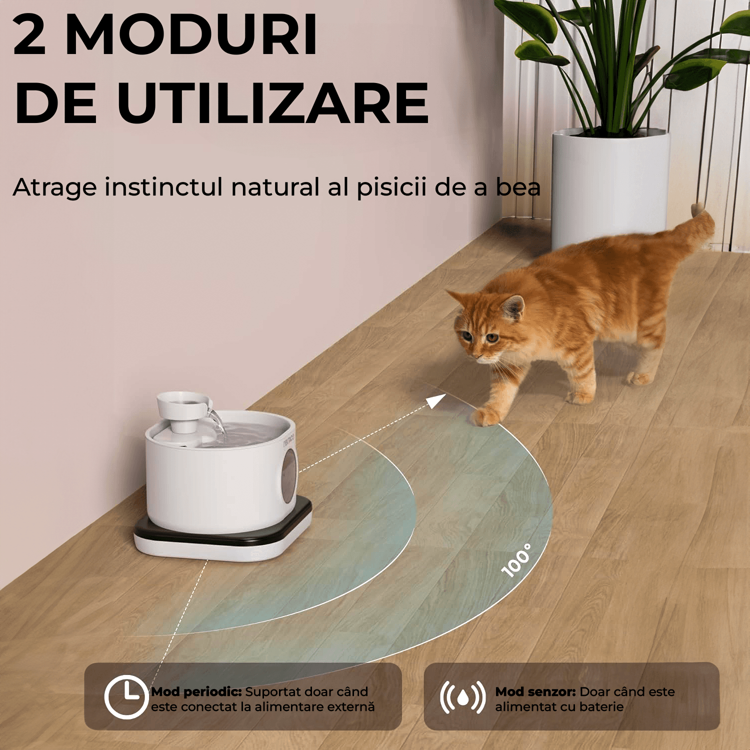 Baterie Externă: Există un design de separare apă-electricitate pentru a elimina orice încărcare din apă și a permite animalelor de companie să bea confortabil; Cu bateria integrată de 5200mAh, fântâna noastră de apă pentru animale de companie poate funcționa până la 30 de zile cu o singură încărcare, astfel încât să vă puteți baza pe ea pentru a satisface nevoile de hidratare ale animalului dvs. de companie, chiar și atunci când sunteți în deplasări de afaceri sau în zone fără electricitate constantă.Indicator Inteligent: Sunteți notificat cu ușurință de indicatorul de baterie scăzută și indicatorul de nivel scăzut al apei, care vă permit să reîncărcați bateria și să reumpleți rezervorul de apă la timp. Cu detectorul de lipsă de apă, pompa se oprește automat atunci când nivelul apei scade sub un nivel sigur pentru a evita supraîncălzirea.2 Moduri de Flux: În modul de inducție, eliberează un flux de 17 secunde când detectează pisica dvs. la o distanță de 100 cm. De asemenea, va elibera automat apă timp de 20 de secunde în fiecare oră pentru a atrage animalele de companie să bea apă în acest mod; Între timp, îl puteți conecta pentru un flux continuu de apă în modul normal (Notă: Nu este inclus un adaptor).
