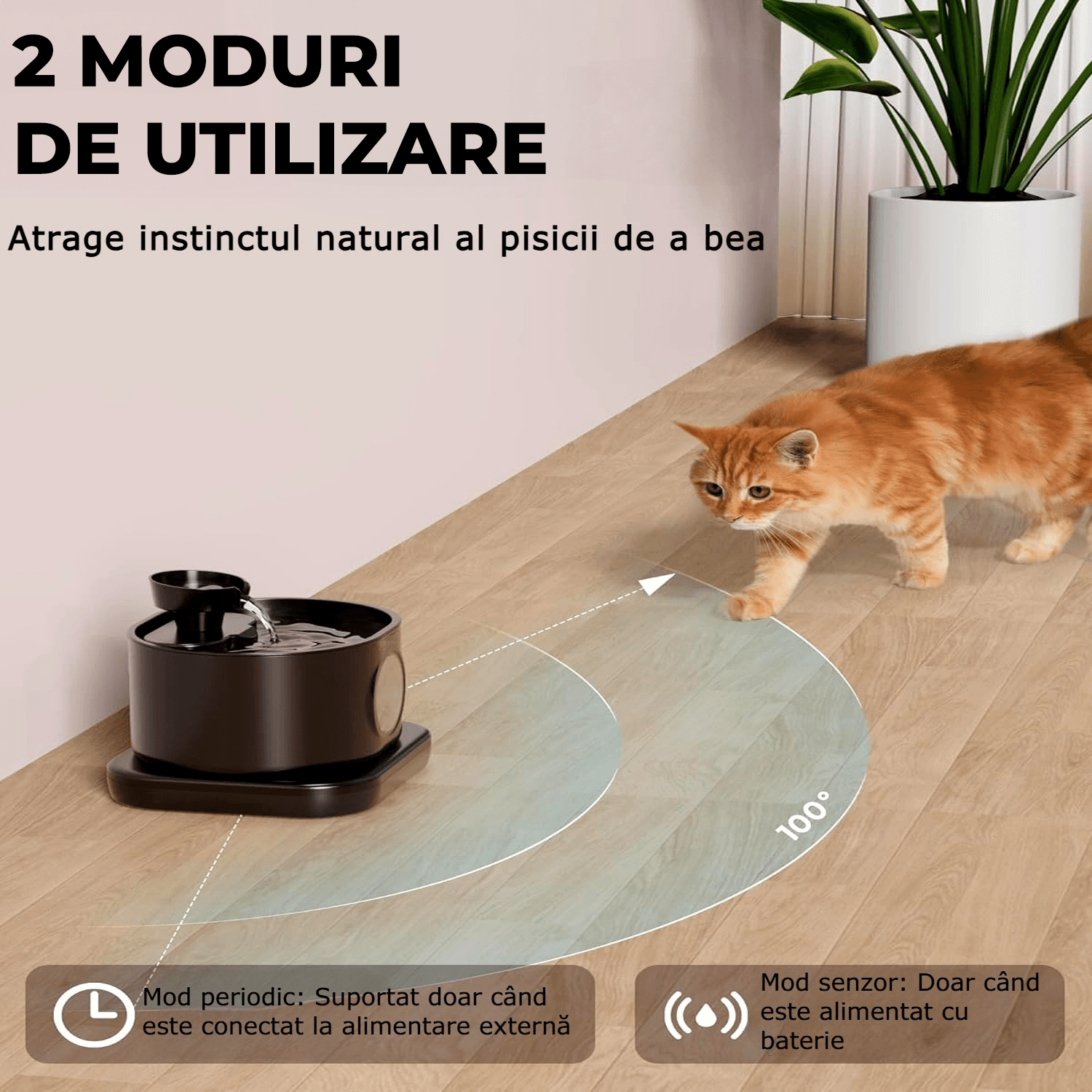 2 Moduri de Flux: În modul de inducție, eliberează un flux de 17 secunde când detectează pisica dvs. la o distanță de 100 cm. De asemenea, va elibera automat apă timp de 20 de secunde în fiecare oră pentru a atrage animalele de companie să bea apă în acest mod; Între timp, îl puteți conecta pentru un flux continuu de apă în modul normal (Notă: Nu este inclus un adaptor).