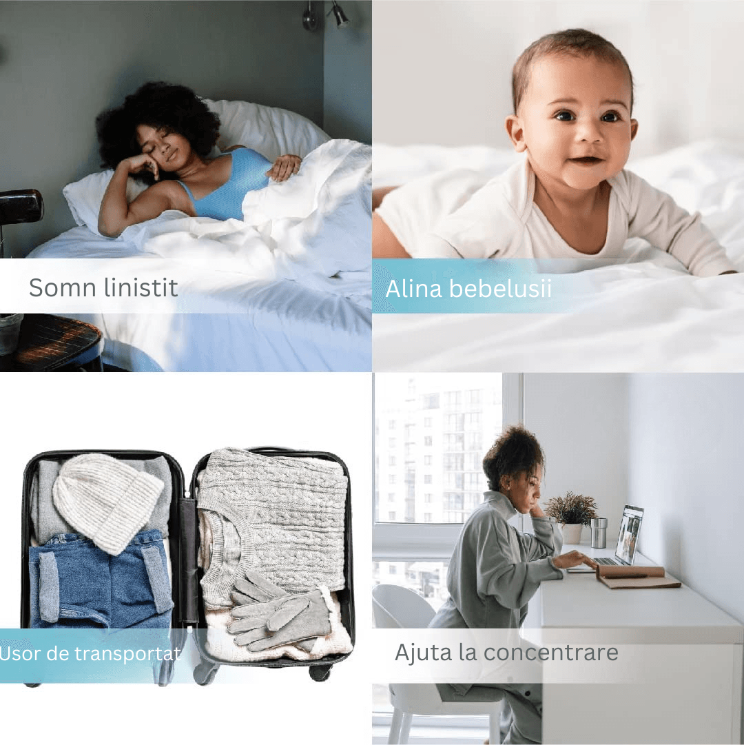 Dispozitivul de sunete albe pentru copii poate fi atarnat la geanta pentru copii, cărucior sau scaun auto, convenabil de utilizat atunci cand ieșiți, liniștiți copilul in mișcare.