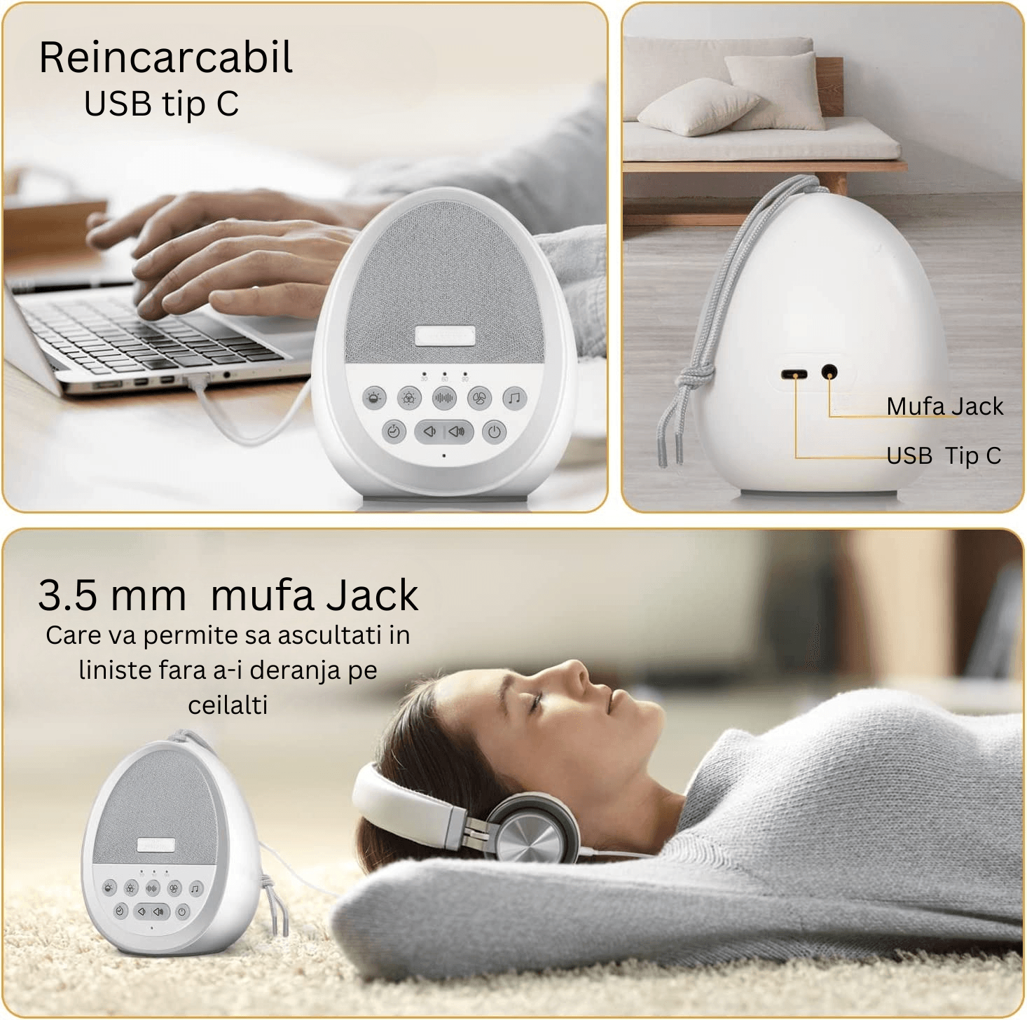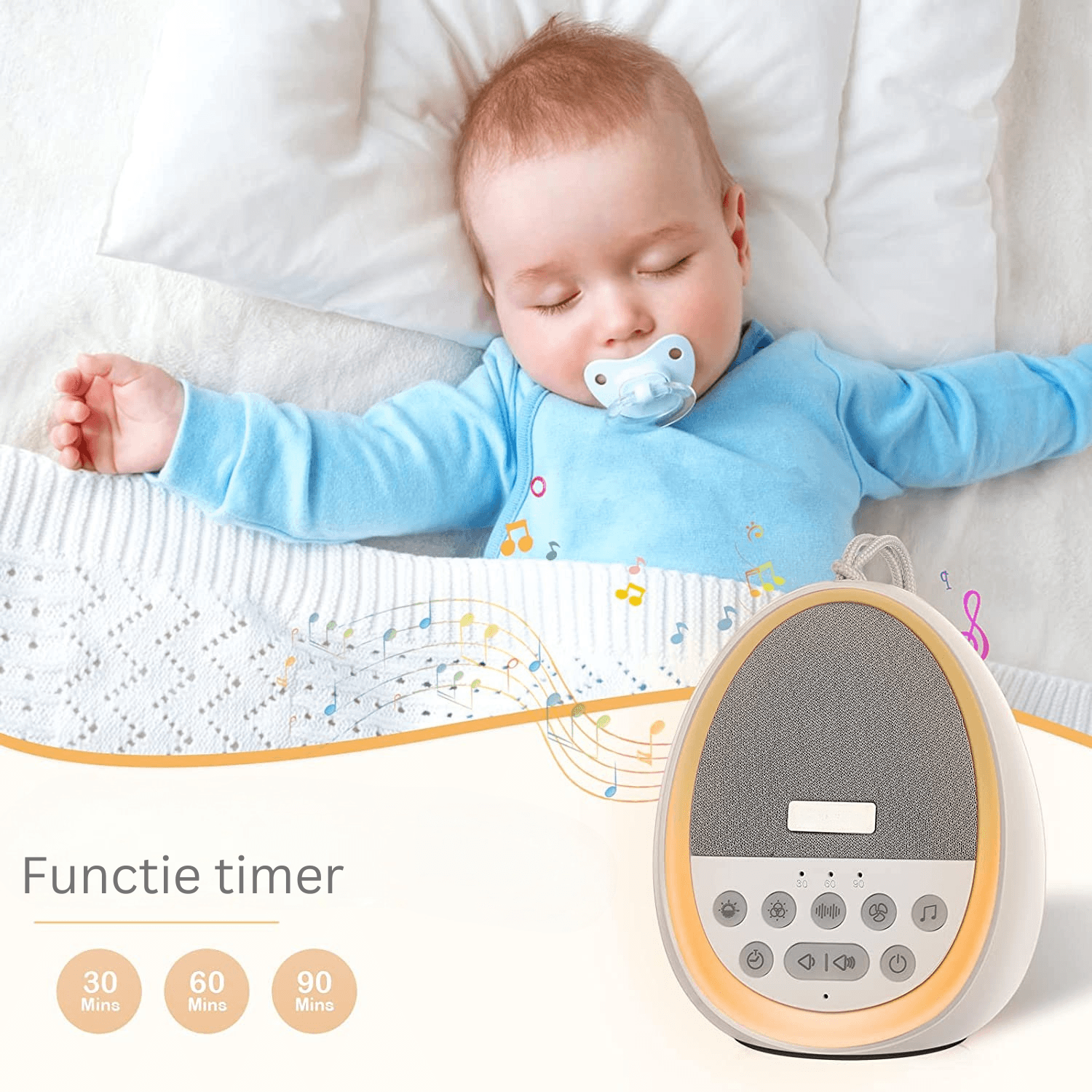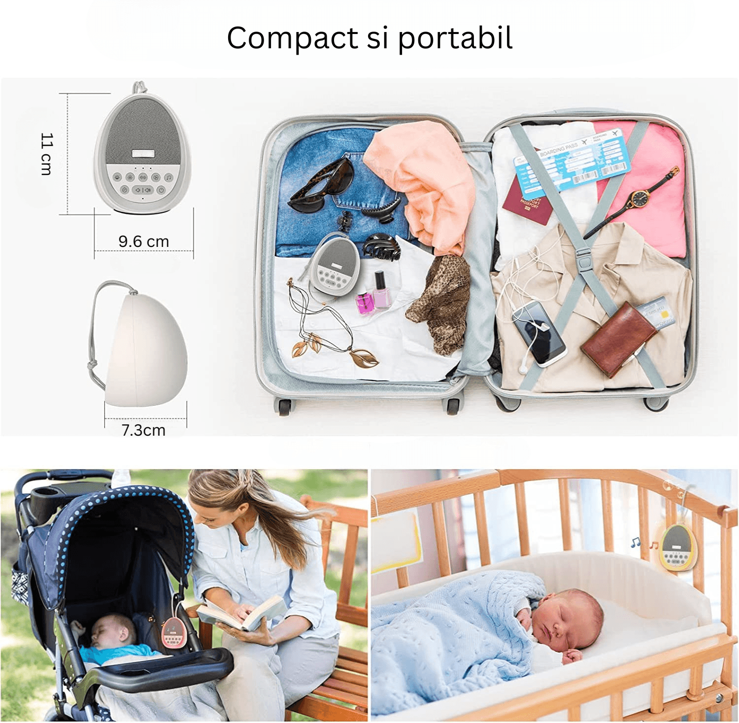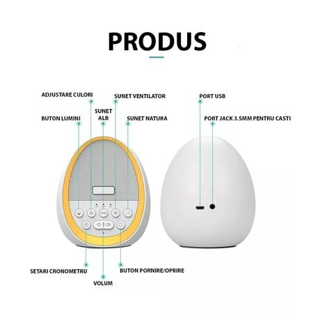 Dispozitiv Sunete Albe, 29 Sunete HD, Portabil, Acumulator 1200mAh, Timer, Lumină de Veghe, Alb