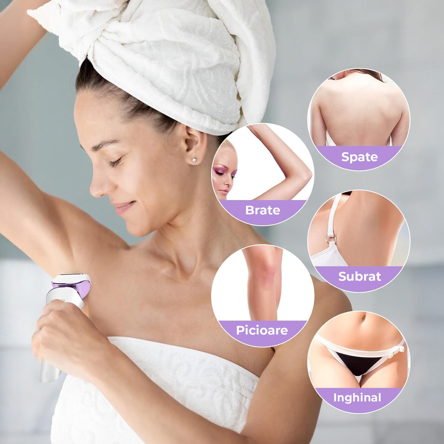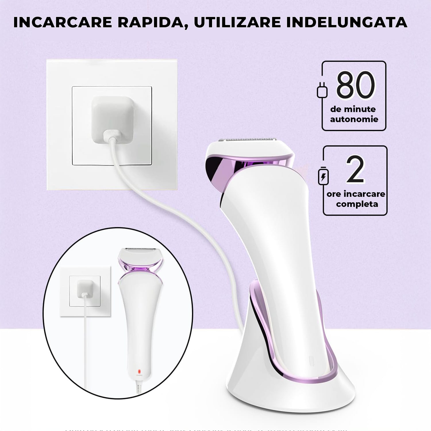 Epilator Umed și Uscat, 3 Tipuri de Lame Detașabile, IPX 6, Reîncărcabil USB, Stație de Încărcare, 900mAh, Mov
