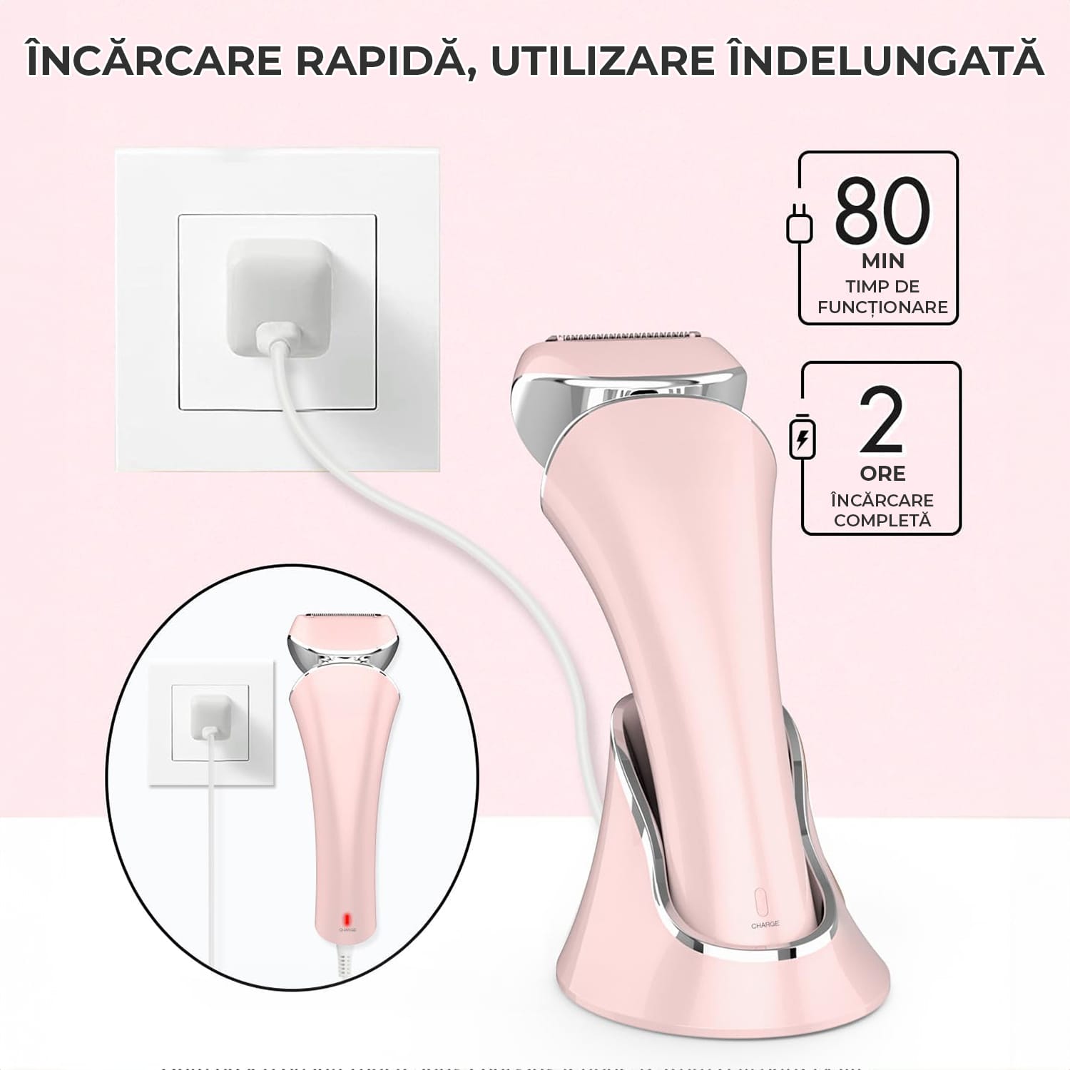 Sistemul de încărcare oferă flexibilitate, aparatul putând fi alimentat direct prin cablu USB sau prin suportul de încărcare inclus. După o încărcare completă de doar două ore, asigură până la 80 de minute de utilizare fără fir.