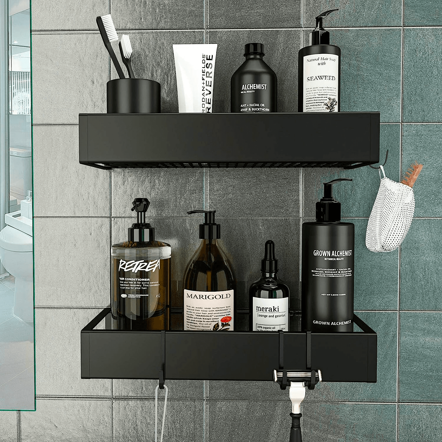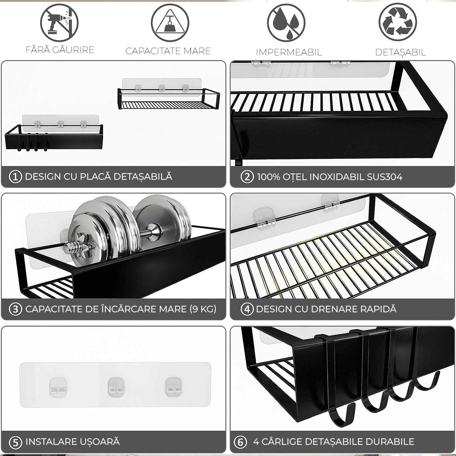 Pachet de 2 Rafturi de Duș - Combinați liber aceste suporturi pentru a ajusta inălțimea intre ele. Acoperirea neagră elegantă asigură ca suporturile să arate mereu ca noi. Designul inteligent permite scurgerea rapidă a apei, evitand astfel pătarea permanentă a rafturilor.