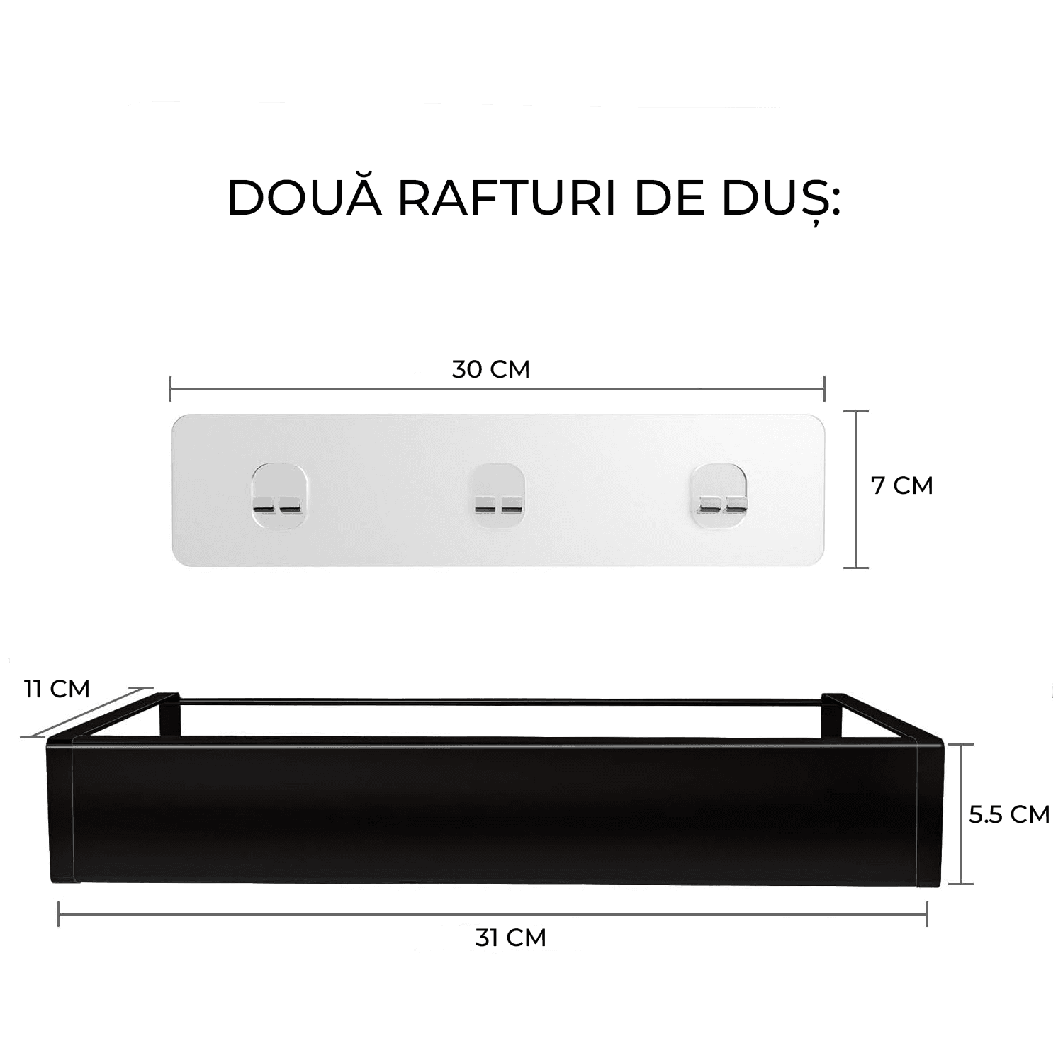 Conținut Pachet - Raft de 31 x 11 x 5.5 cm cu o placă frontală detașabilă, 2 suporturi versatile și 4 carlige detașabile pentru aparate de ras, prosoape, bureți, haine de spălat și altele