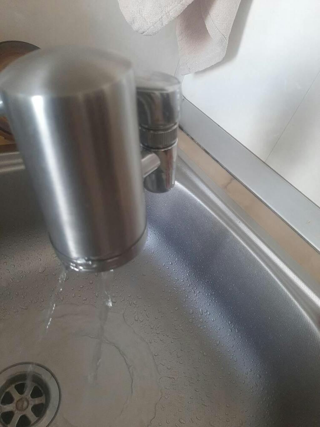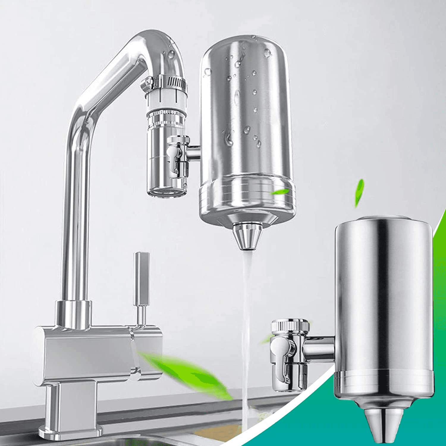Filtru de purificare al apei de la robinet care se monteaza simplu, direct pe baterie, elimina metalele grele, impuritatile si clorul.