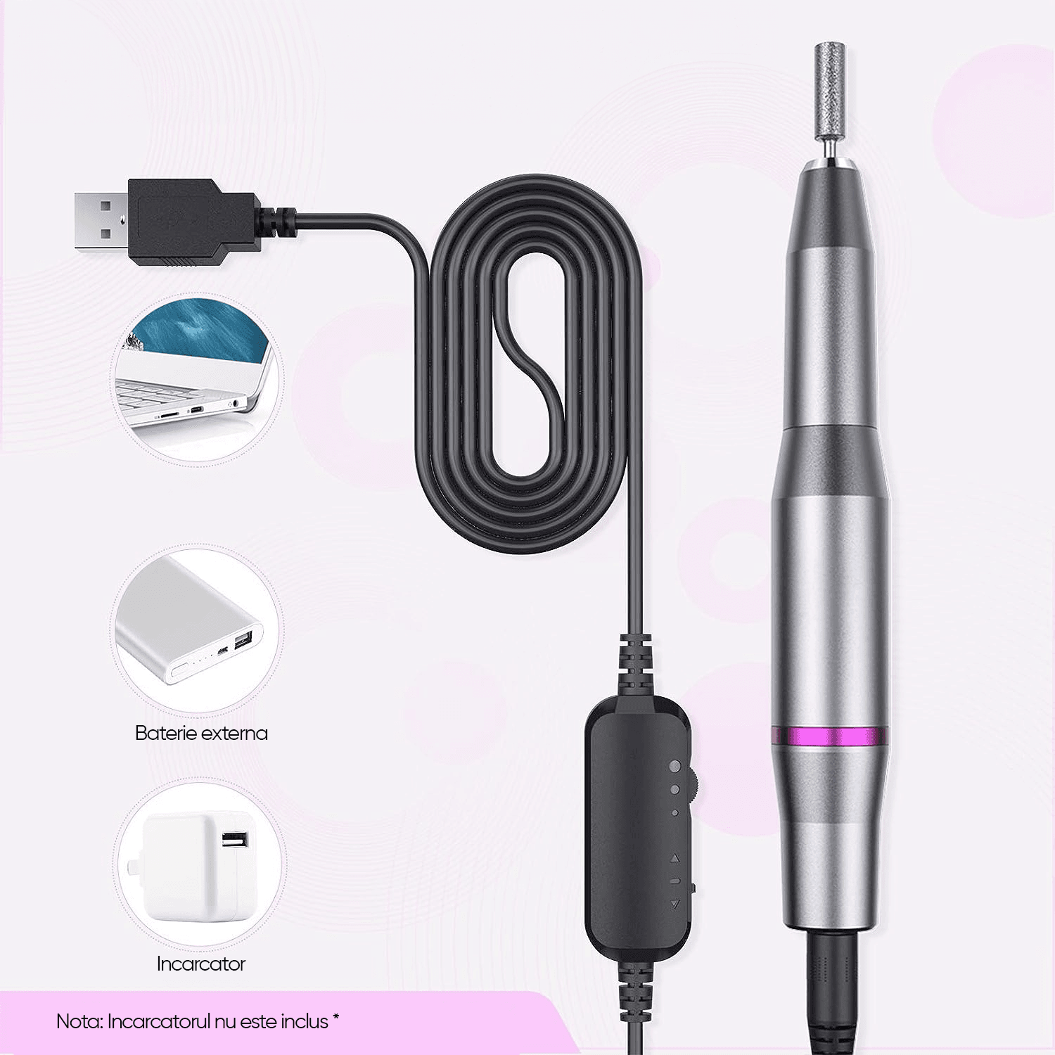 Usor de folosit: Aceasta freza de unghii are o interfata USB standard, mai durabila si stabila, puteti conecta la orice dispozitiv USB, cum ar fi bateria externa, laptopul sau adaptorul AC (Intrare: 5V/2A). Design subtire, usoara si compacta, cu o greutate de 90gr.
