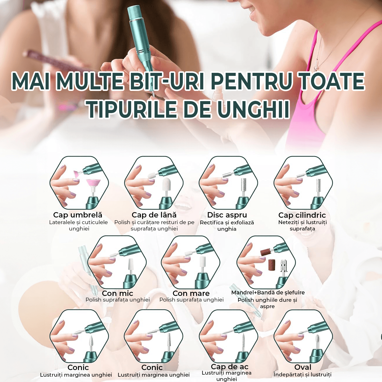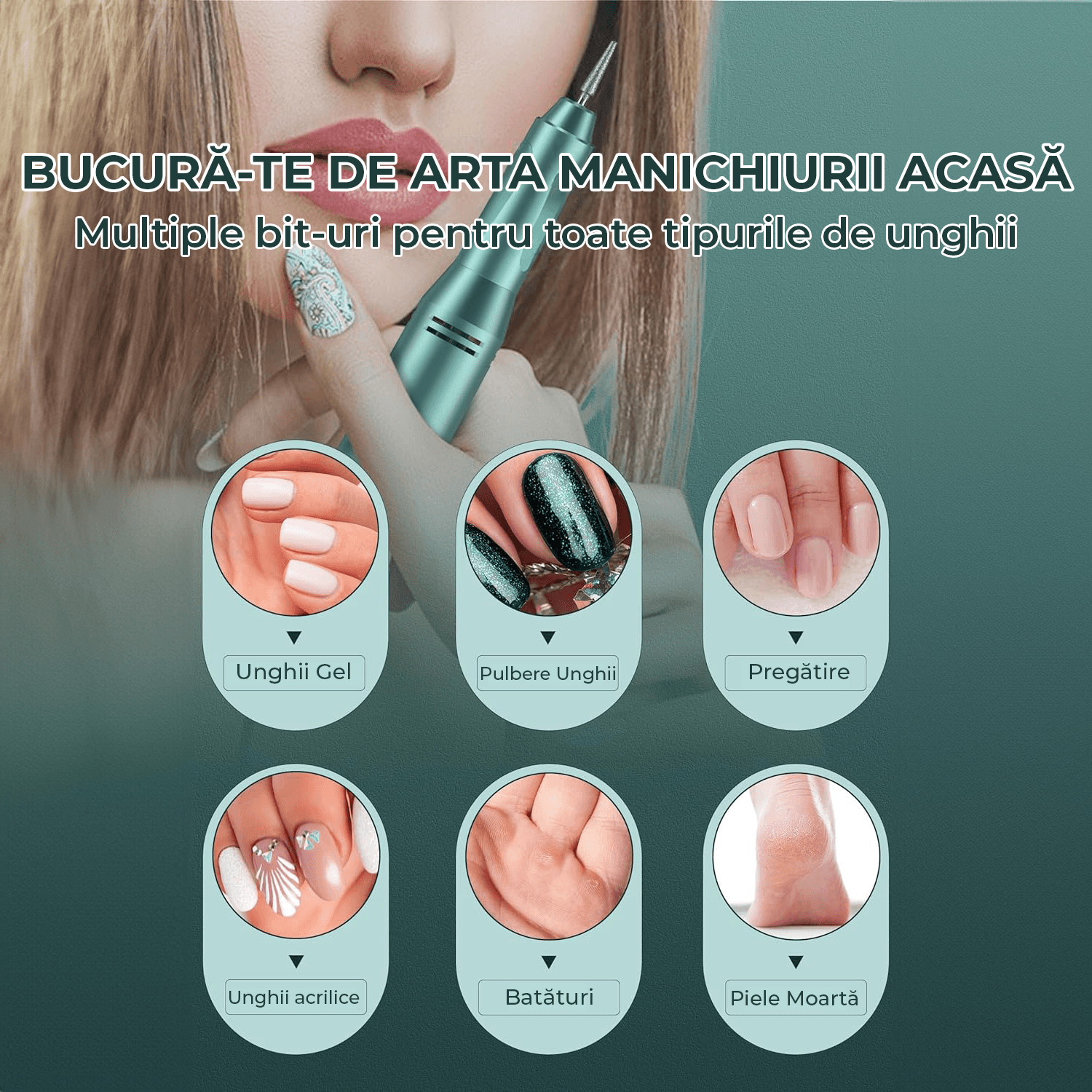 FREZA UNGHII PROFESIONALA: Freza electrica fara fir este dotata cu 12 bit-uri diferite de unghii. Pilapentru unghii acrilice poate fi folosita pentru slefuire, taiere, lustruire, aplicare pulbere acrilica, sculptura si indepartare gel, cuticule si piele moarta fara a rani mainile si unghiile.