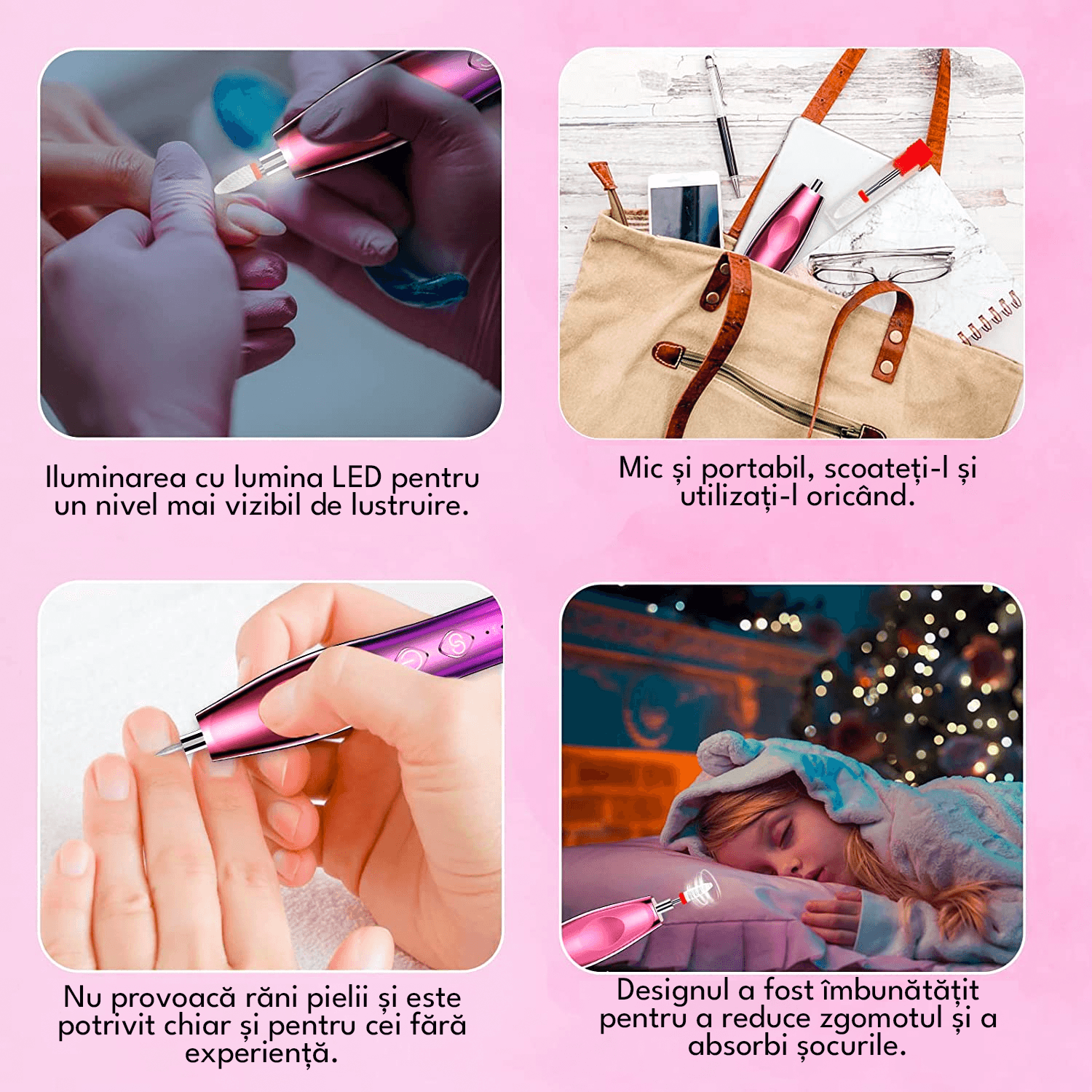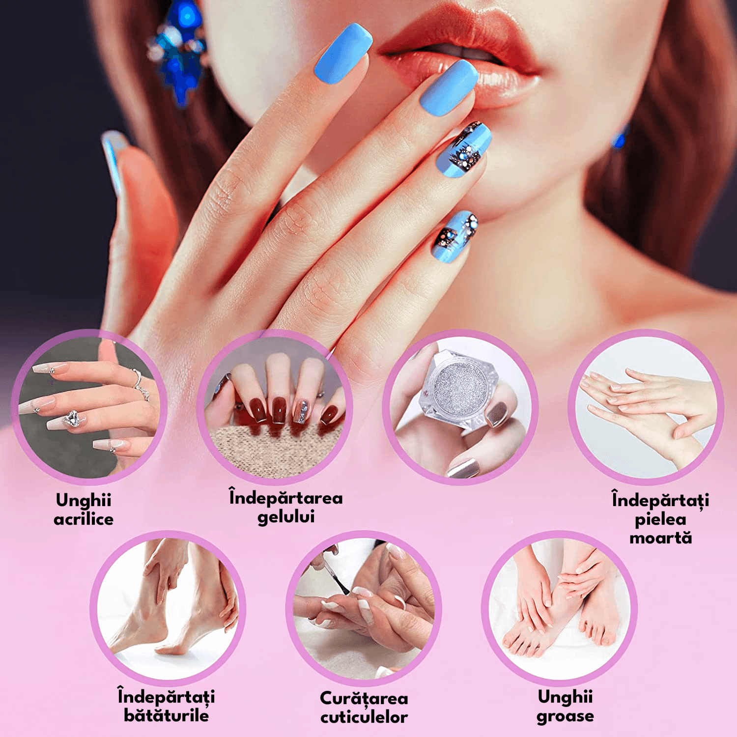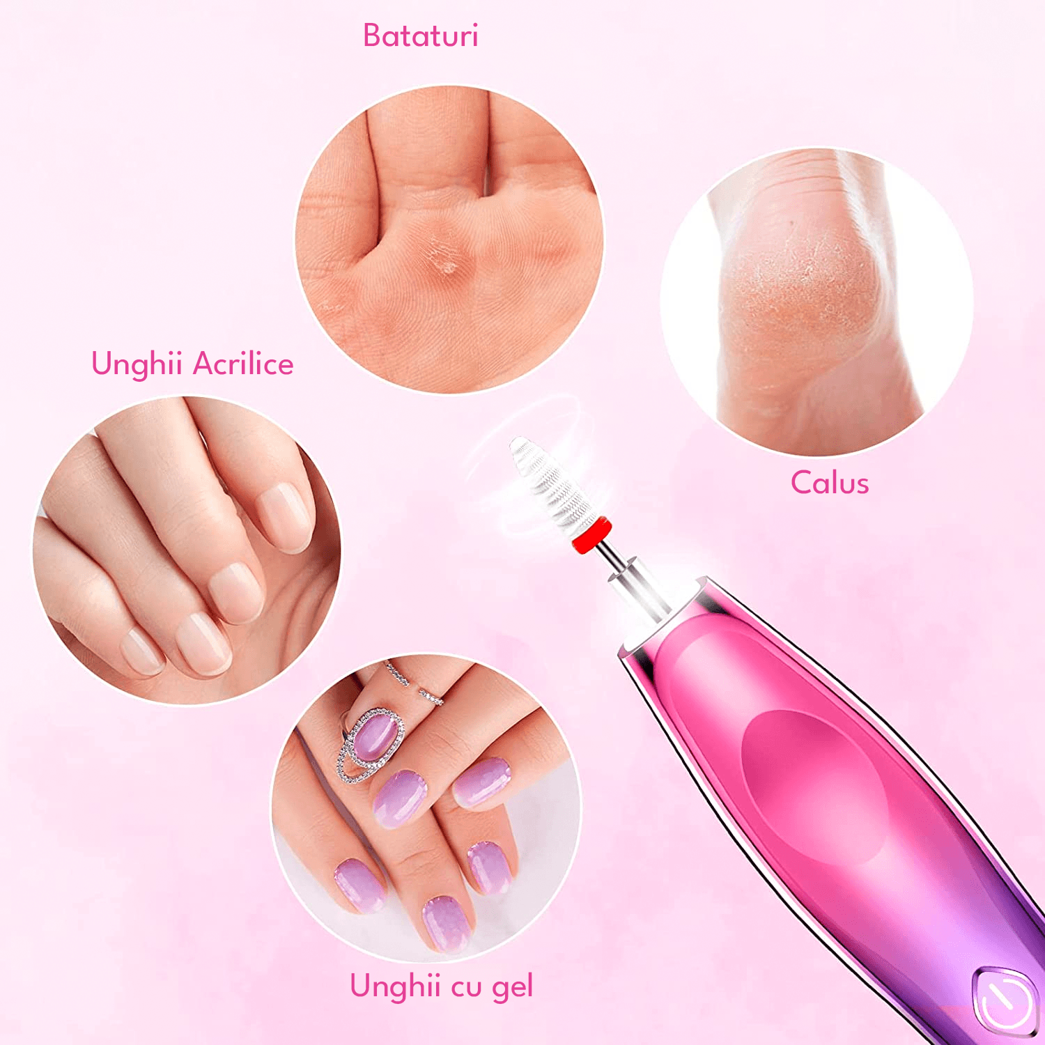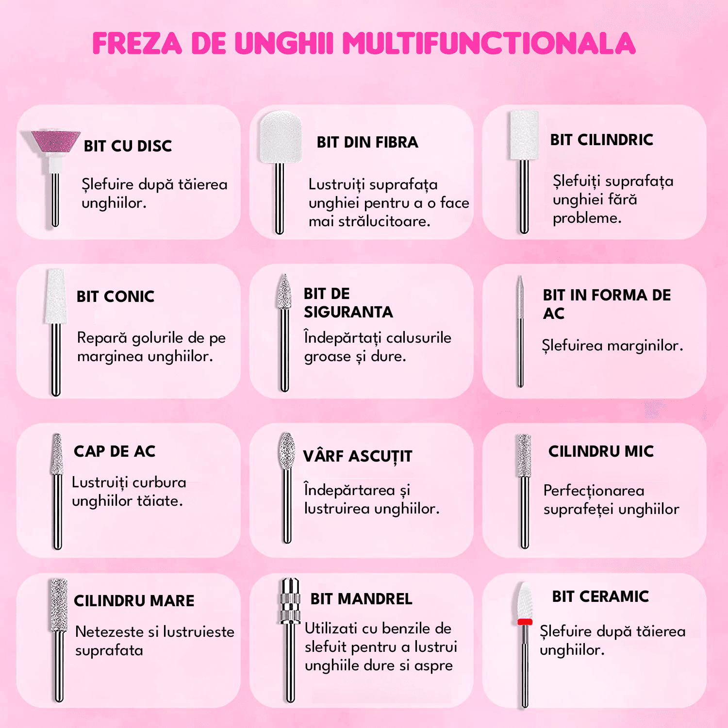 Setul include 11 tipuri de capete abrazive care pot fi inlocuite in functie de nevoile tale de ingrijire a unghiilor, inclusiv un cap abraziv separat din ceramica. Usor de utilizat, potrivit in special pentru incepatori.