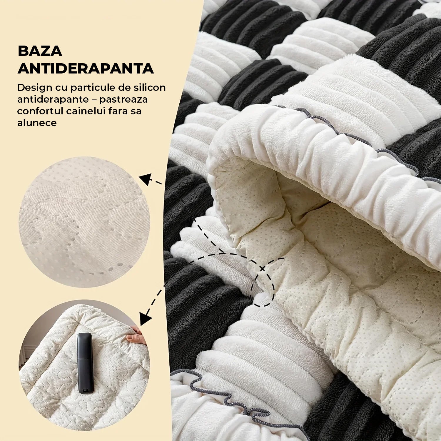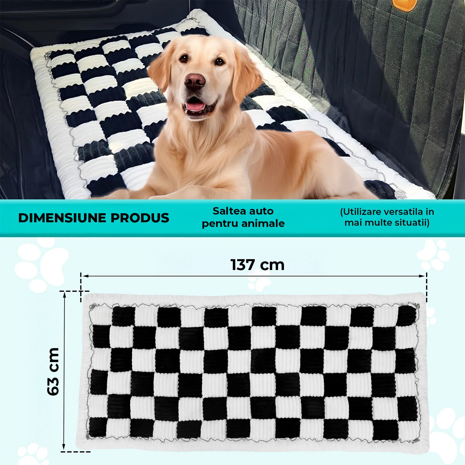 Stratul interior generos mentine forma produsului si ramane pufos chiar si dupa utilizari repetate. Baza este prevazuta cu particule antiderapante din silicon, care impiedica alunecarea pe bancheta si asigura stabilitate chiar si in timpul miscarii animalului. Dimensiunea de 137 × 63 × 5 cm o face potrivita pentru majoritatea autoturismelor, SUV-urilor si camioanelor, inclusiv pentru extensii de bancheta spate.