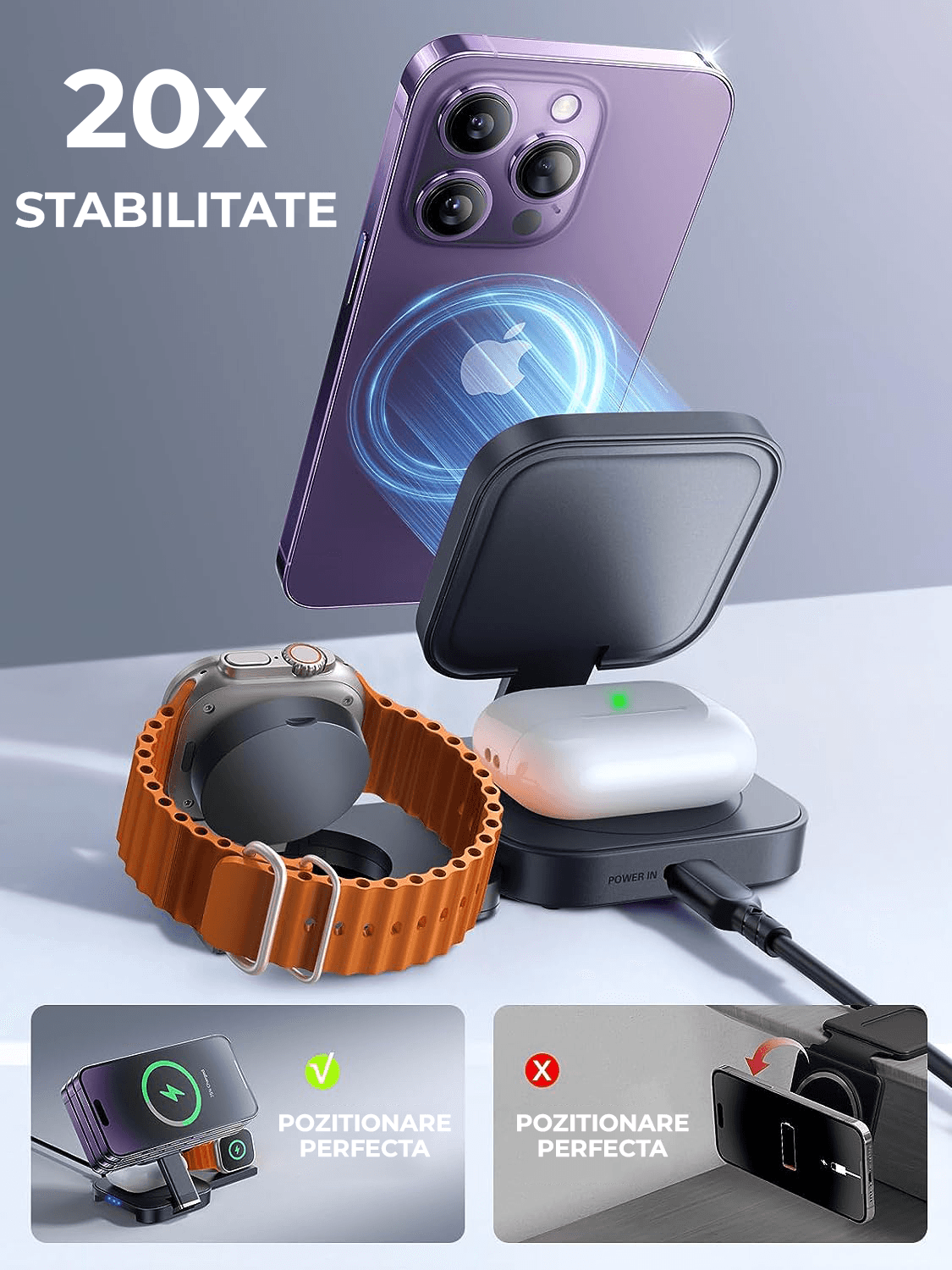 Incarcator 3-in-1 Wireless: O solutie de incarcare wireless completa pentru iPhone-ul dvs., Apple Watch si AirPods. O optiune excelenta pentru a va organiza spatiul acasa, la birou, in calatorii, in hotel sau in sala de intalniri. Va permite sa spuneti adio cablurilor incalcite si firelor dezordonate, mentinandu-va spatiul ordonat si organizat, oferindu-va o solutie de incarcare practica.