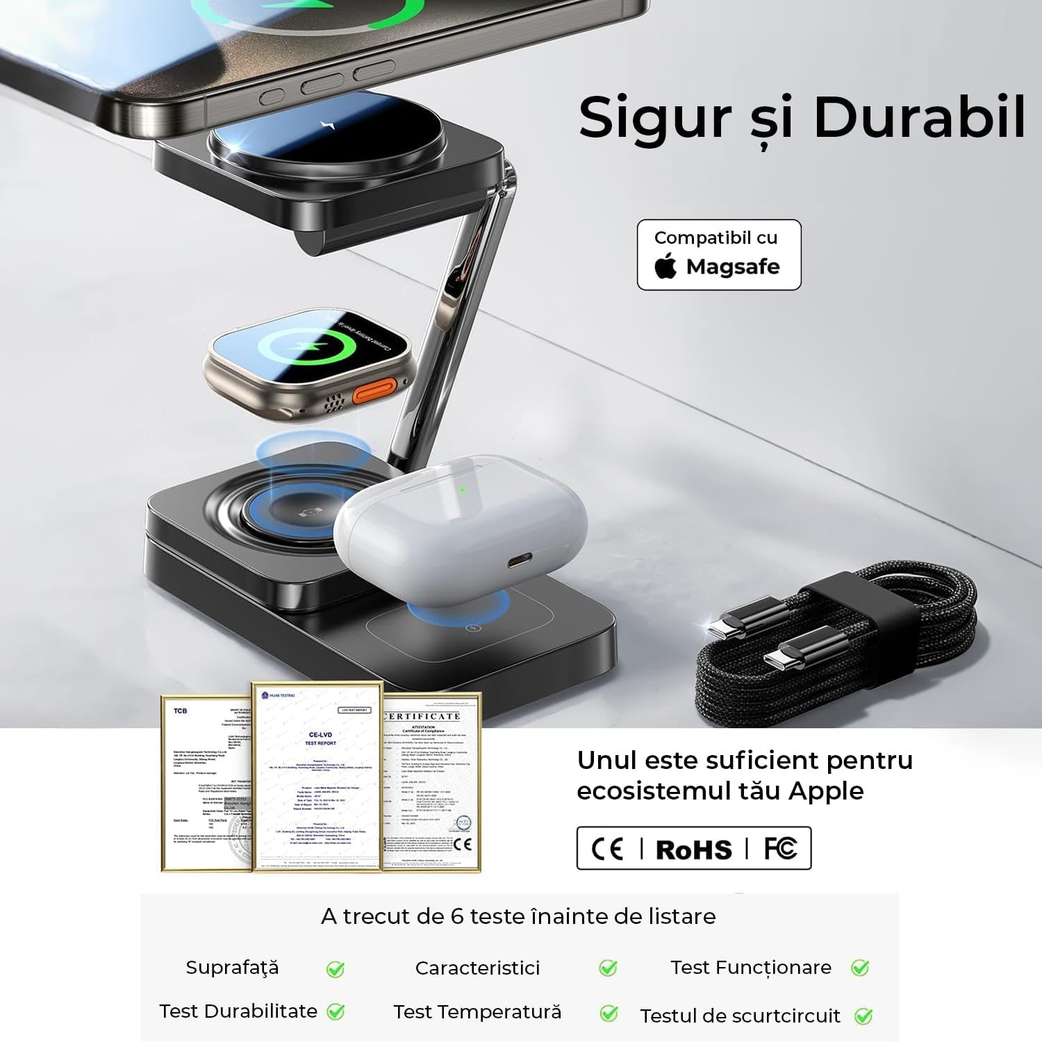 Material Durabil:  Adio suporturilor de incarcare Magsafe din plastic fragil, statia de incarcare pentrudispozitivele Apple ramane stabila si elegantatoate intr-una! Stabilitatea tijei reglabile din aliaj de zinc estecrescuta de 10 ori, iar durabilitatea este de 20 de ori mai buna in comparatie cu metalul obisnuit.