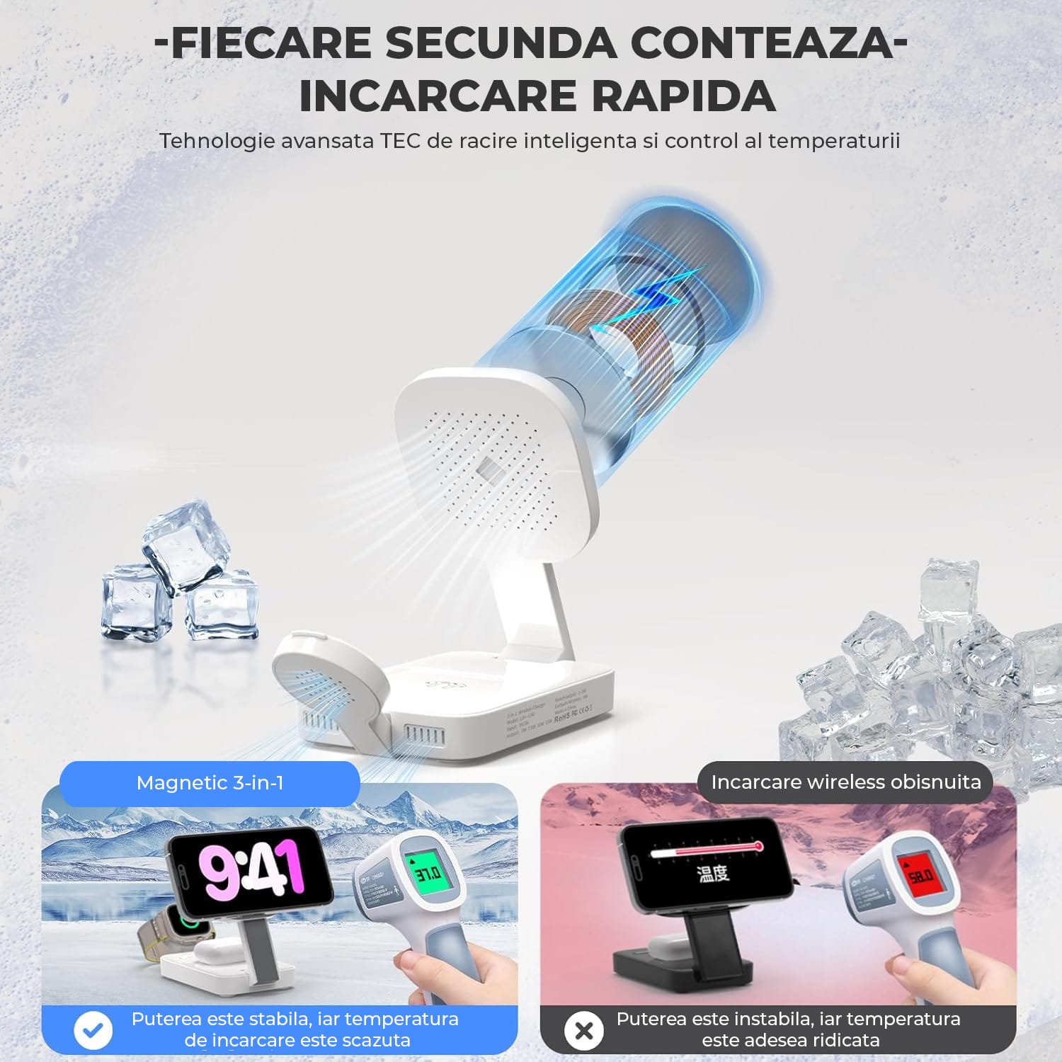 Această stație de încărcare wireless este echipată cu tehnologii avansate pentru protecție împotriva supraîncălzirii, supratensiunii, scurtcircuitului și detectării obiectelor străine. Datorită sistemului de răcire inteligent TEC, oferă o încărcare stabilă, rapidă și sigură chiar și atunci când alimentează 3 dispozitive simultan.
