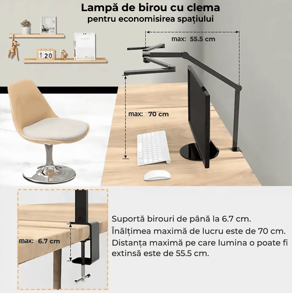 Extindere Ultra-Wide: Cu o raza de extindere de 55.5 cm, aceasta lampa asigura acoperirea completa a biroului dvs. de colt.