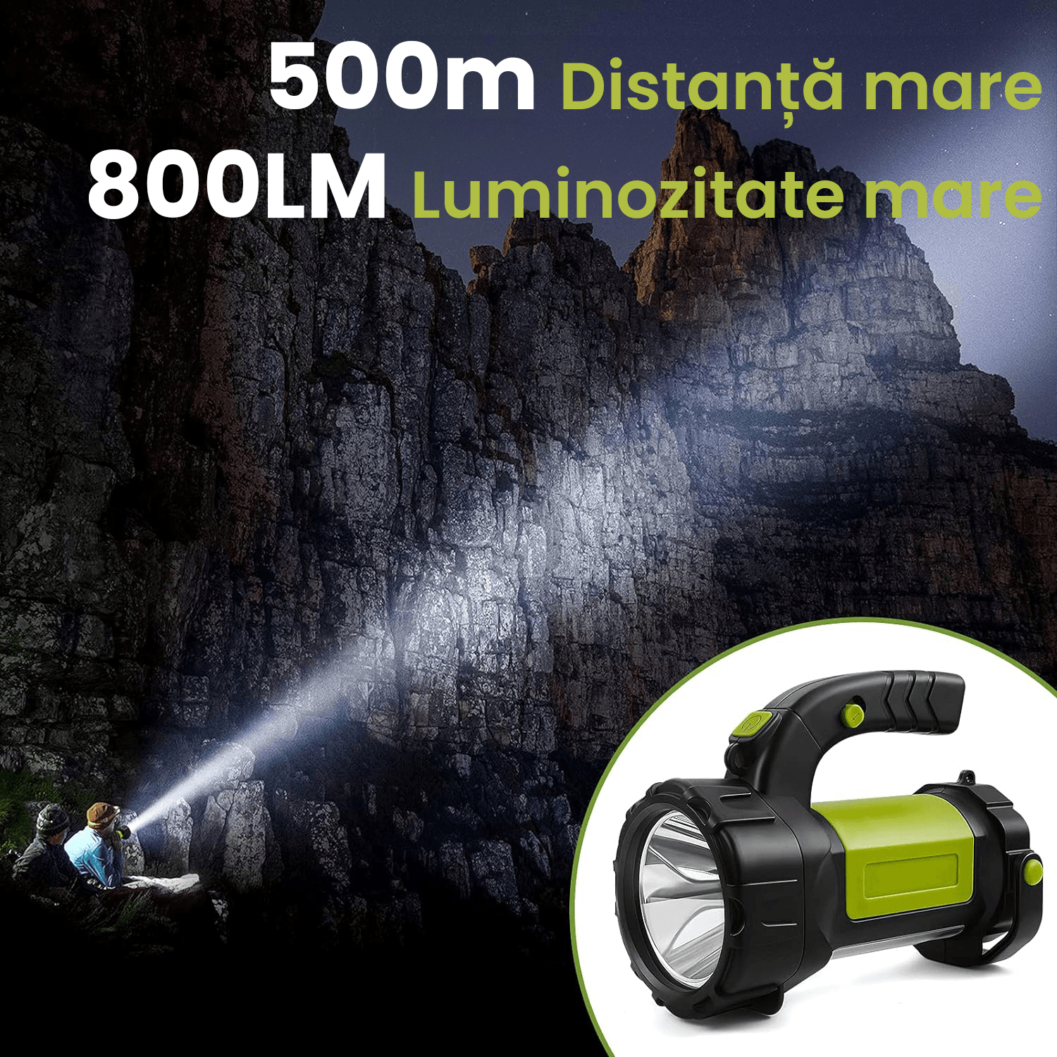 Lanterna LED Camping Reîncărcabilă, 800LM, 500m, Acumulator 3600mAh, 4 în 1, 7 Moduri, Verde/Negru