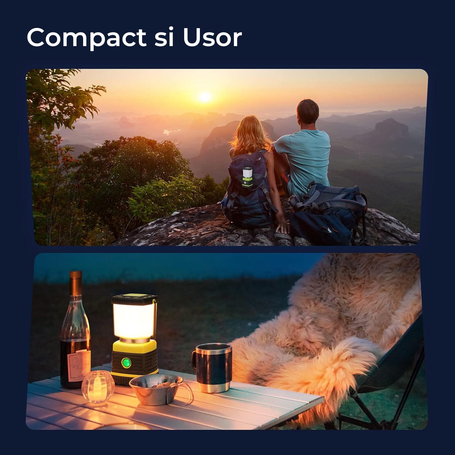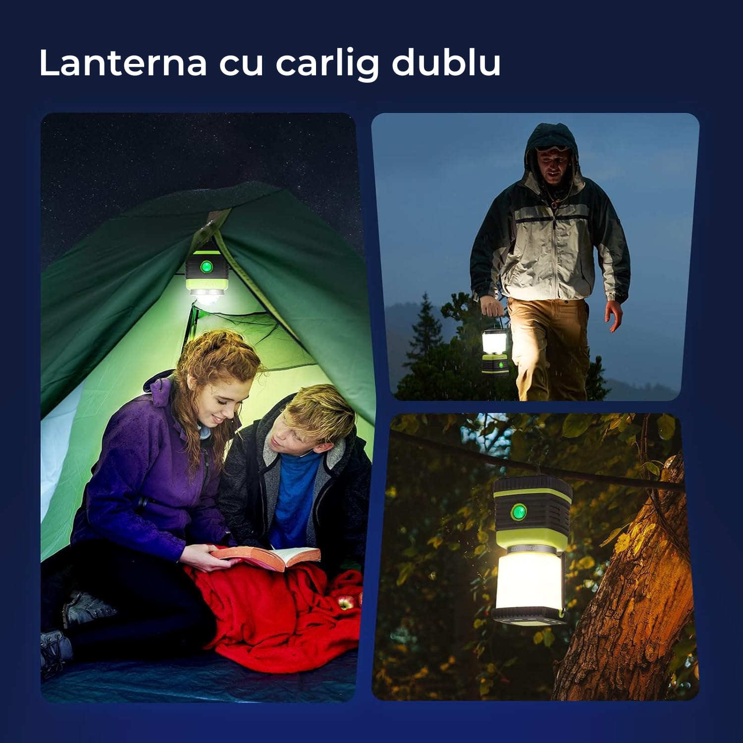 Lanterna este prevazuta cu un maner integrat in partea superioara si un carlig ascuns in partea de jos, facilitand agatarea si transportul. Capacul transparent poate fi indepartat pentru o iluminare mai concentrata, transformand lanterna intr-o sursa de lumina suspendata perfecta pentru corturi sau spatii de lucru.
