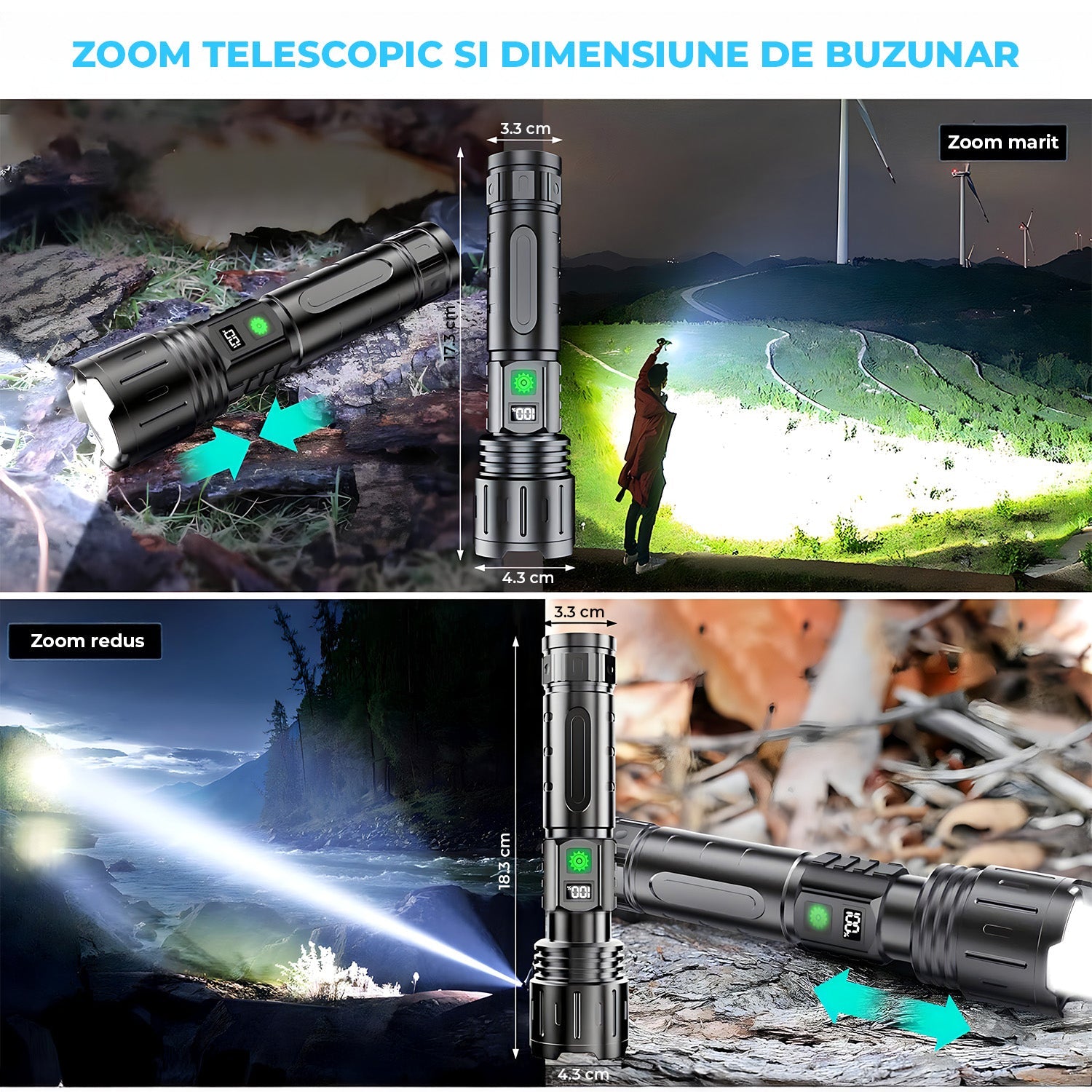 Moduri: puternic, mediu, slab, intermitent, SOS. Oprire rapidă prin apăsare lungă (2 secunde). Zoom reglabil pentru lumină concentrată sau dispersată.