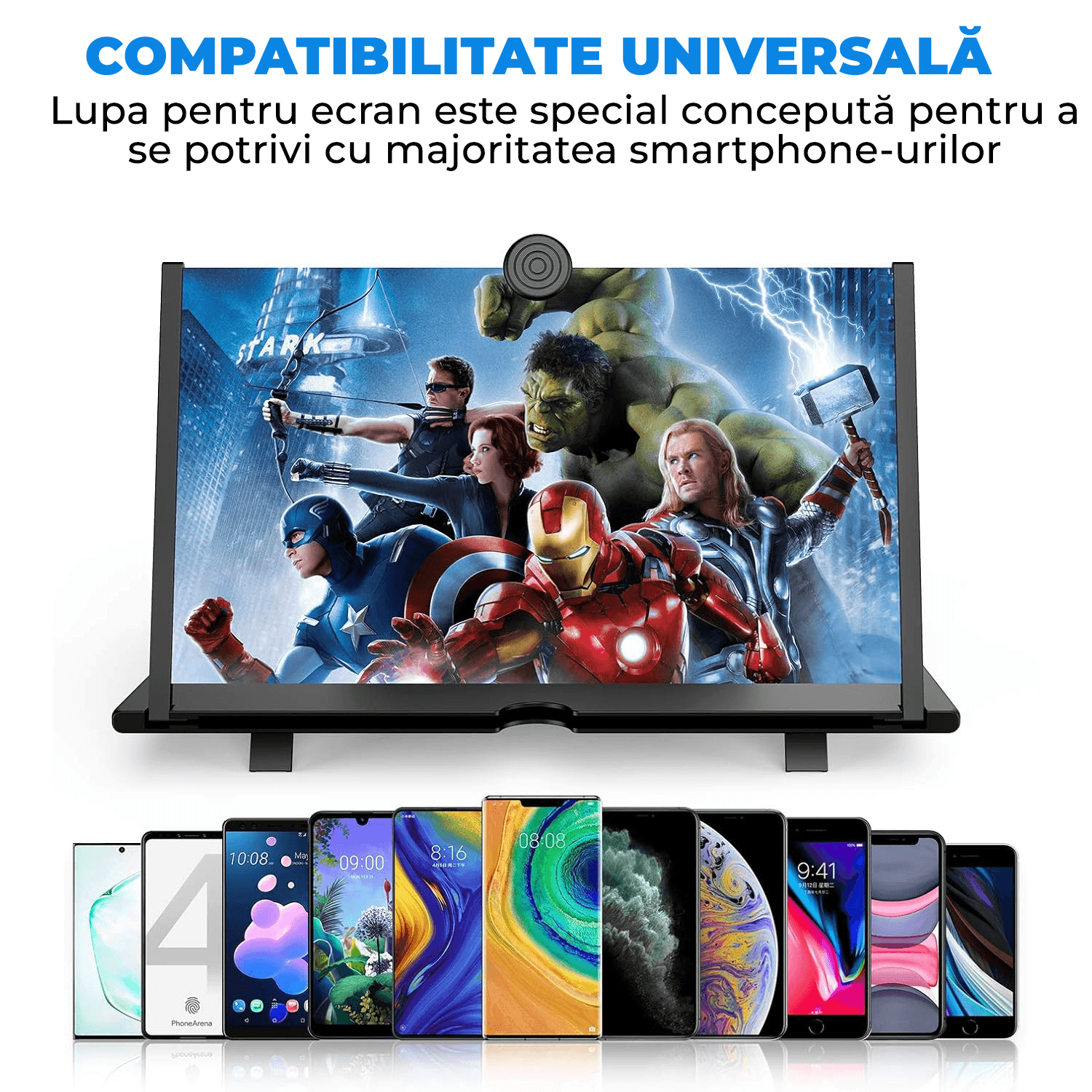 Lupa Pliabila Elindor® pentru Telefon cu Efect 3d si Zoom 4x Marire, Diagonala de 12 inch, suport telefon universal, Negru