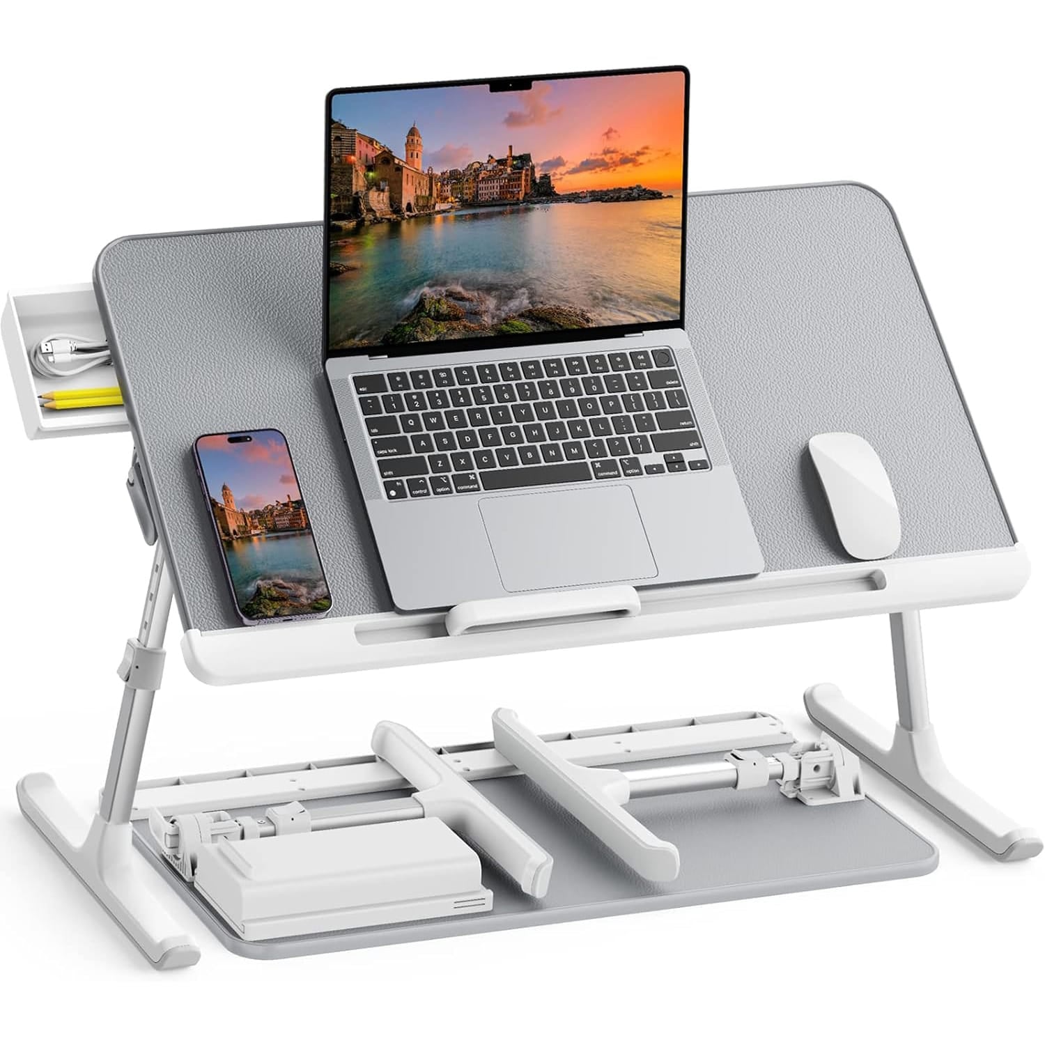 Masa pliabila pentru Laptop, Multifunctionala,  Ajustabila, din Piele PVC, birou portabil cu sertar de depozitare, Gri