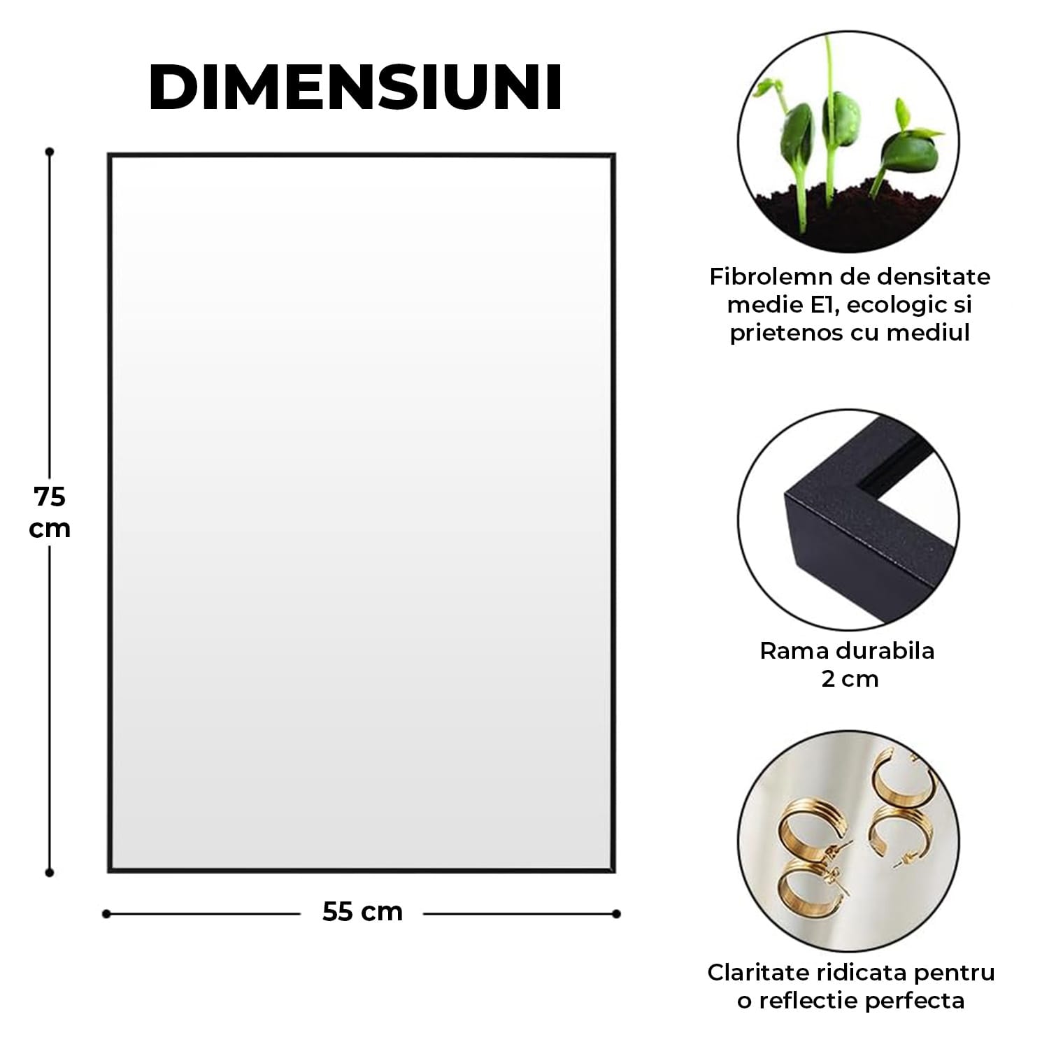 Oglinda Dreptunghiulara Elindor®, 55x75 cm, Sticla Fara Distorsiuni, Usor de Instalatat, Negru