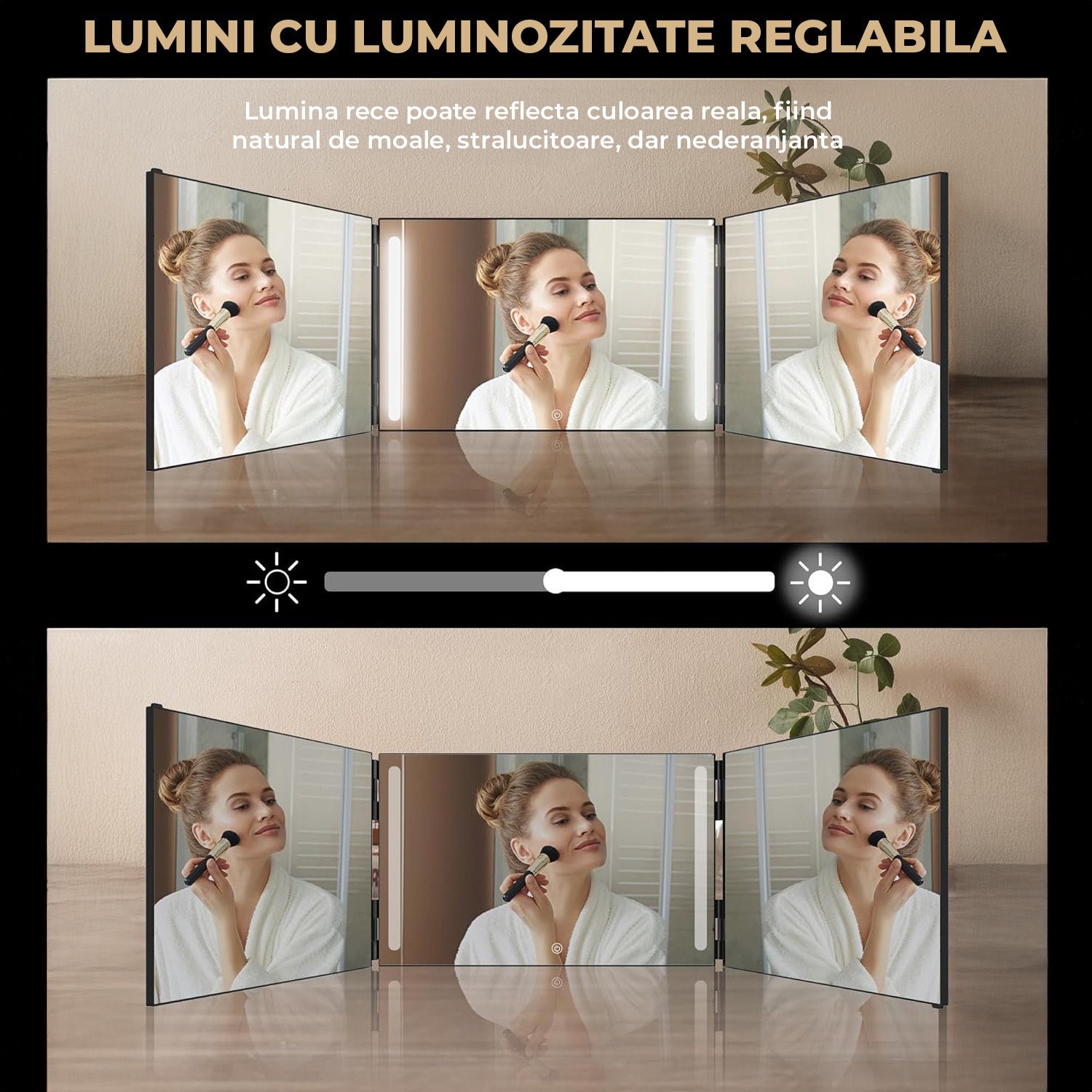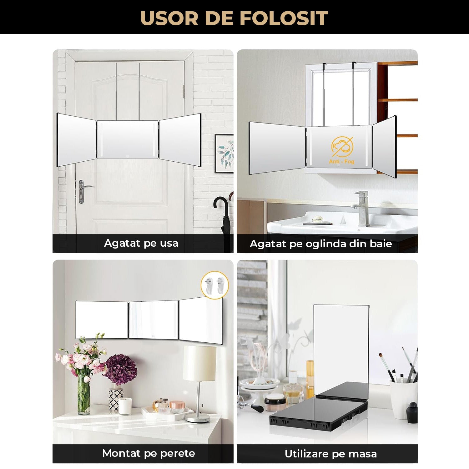 Oglindă Trifold Cu Vizualizare 360°, LED Reîncărcabil, Anti-Aburire și Reglabilă – Tuns, Coafat și Îngrijire Personală Ca La Salon