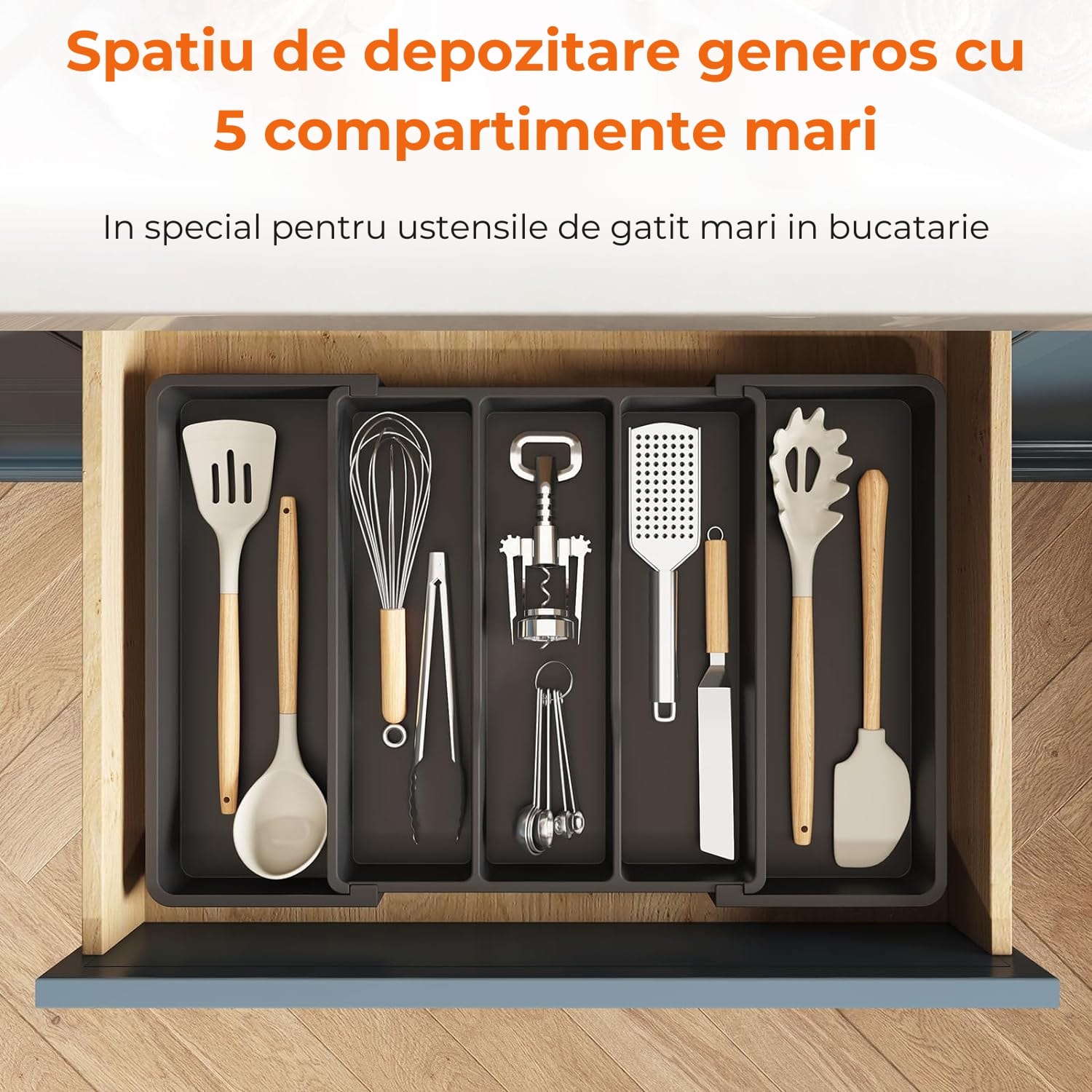 Organizator Extensibil Multifuncțional pentru Sertar, Suport Ajustabil pentru Ustensile de Gătit, Separator pentru Spatule, Negru, Fără BPA
