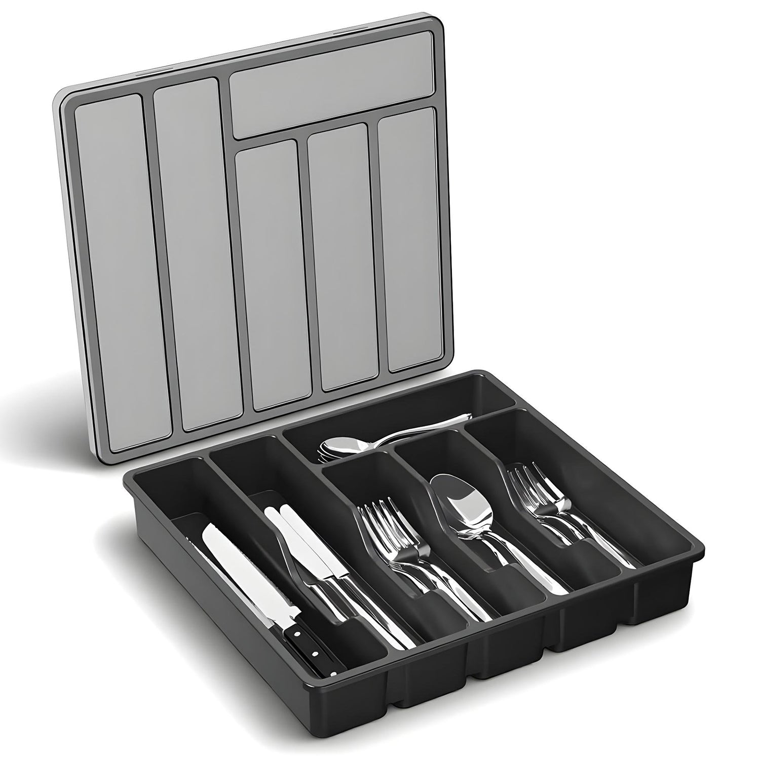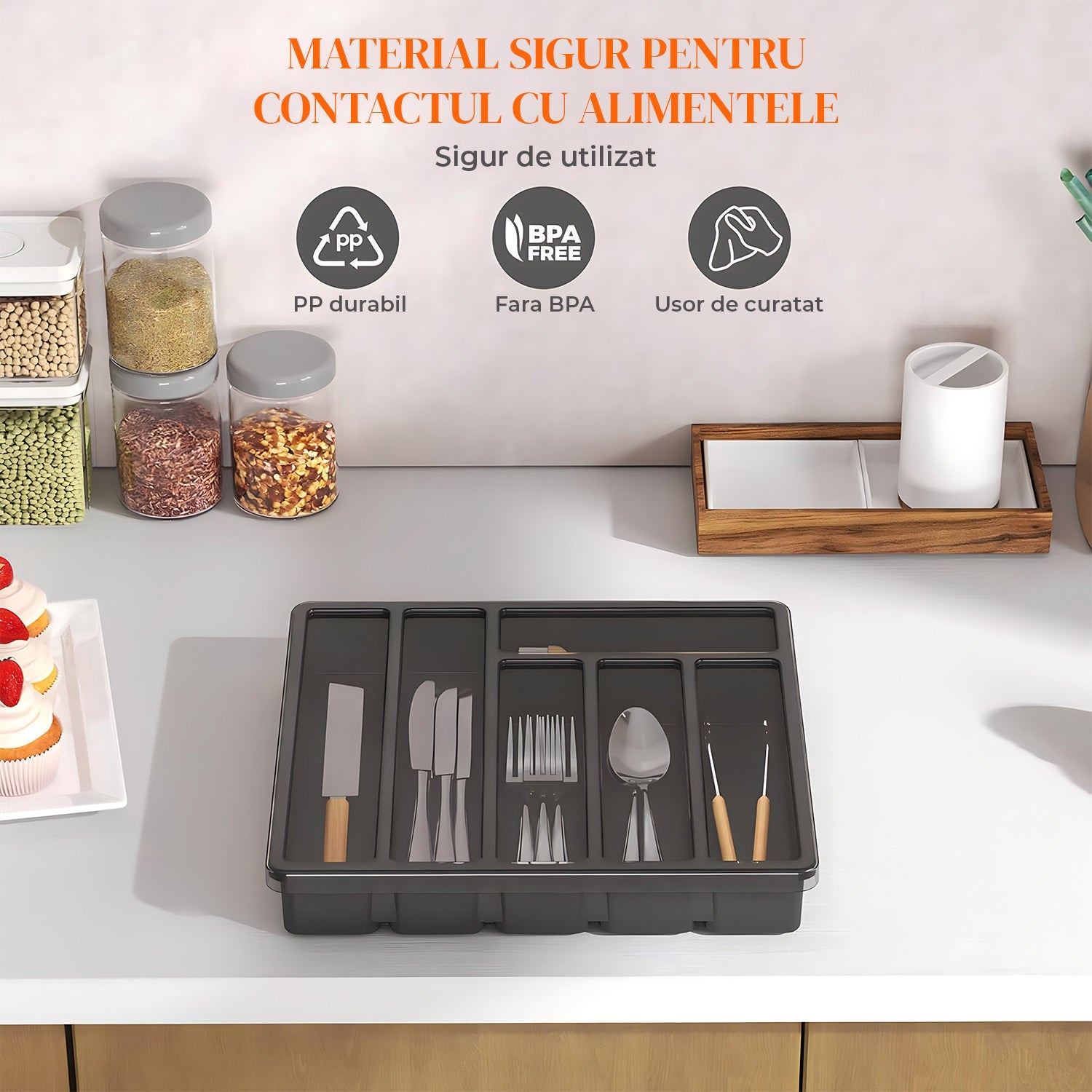 Dispune de 6 compartimente, inclusiv 2 lungi pentru cutite si ustensile mari si 4 medii pentru linguri, furculite si accesorii mici. Asigura ordinea si accesul rapid la tacamuri.