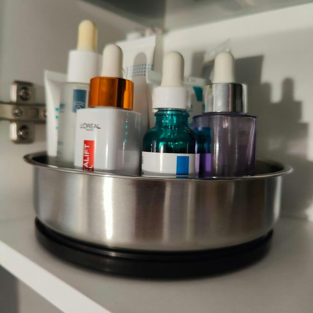 Organizator Rotativ 360° Elindor®, Otel Inoxidabil 304, 1 Nivel, Pentru Condimente, Cafea, Ceai, Borcane, Sticle, Produse Cosmetice, Accesorii Baie, Mirodenii, Dulapuri, Sertare, Bucatarie, Baie, Birou, Suprafata Antiaderenta, 19.5x6 cm, Argintiu