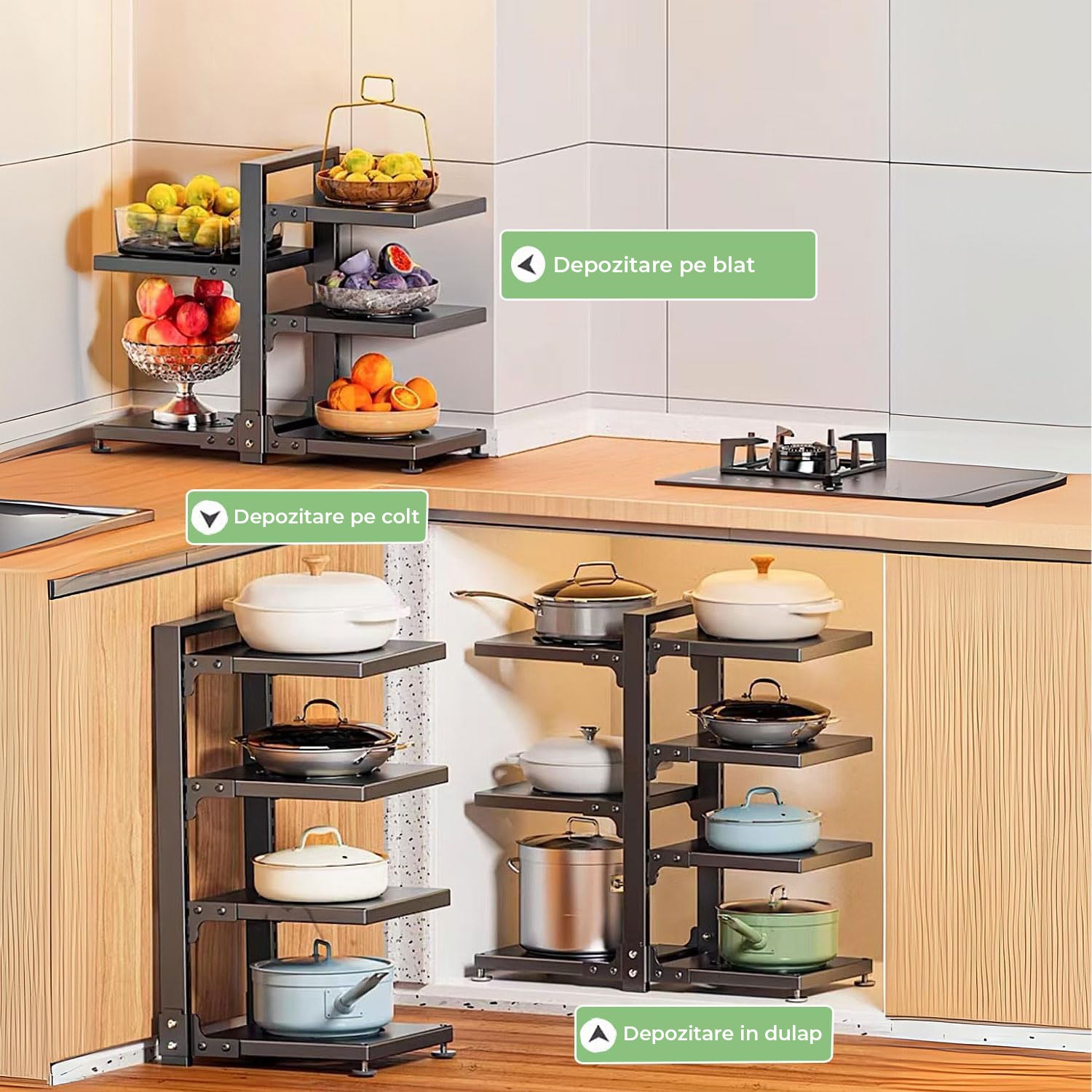 • Capacitate mare de depozitare: pastreaza oalele si capacele organizate si la indemana, eliberand spatiul de pe blat.