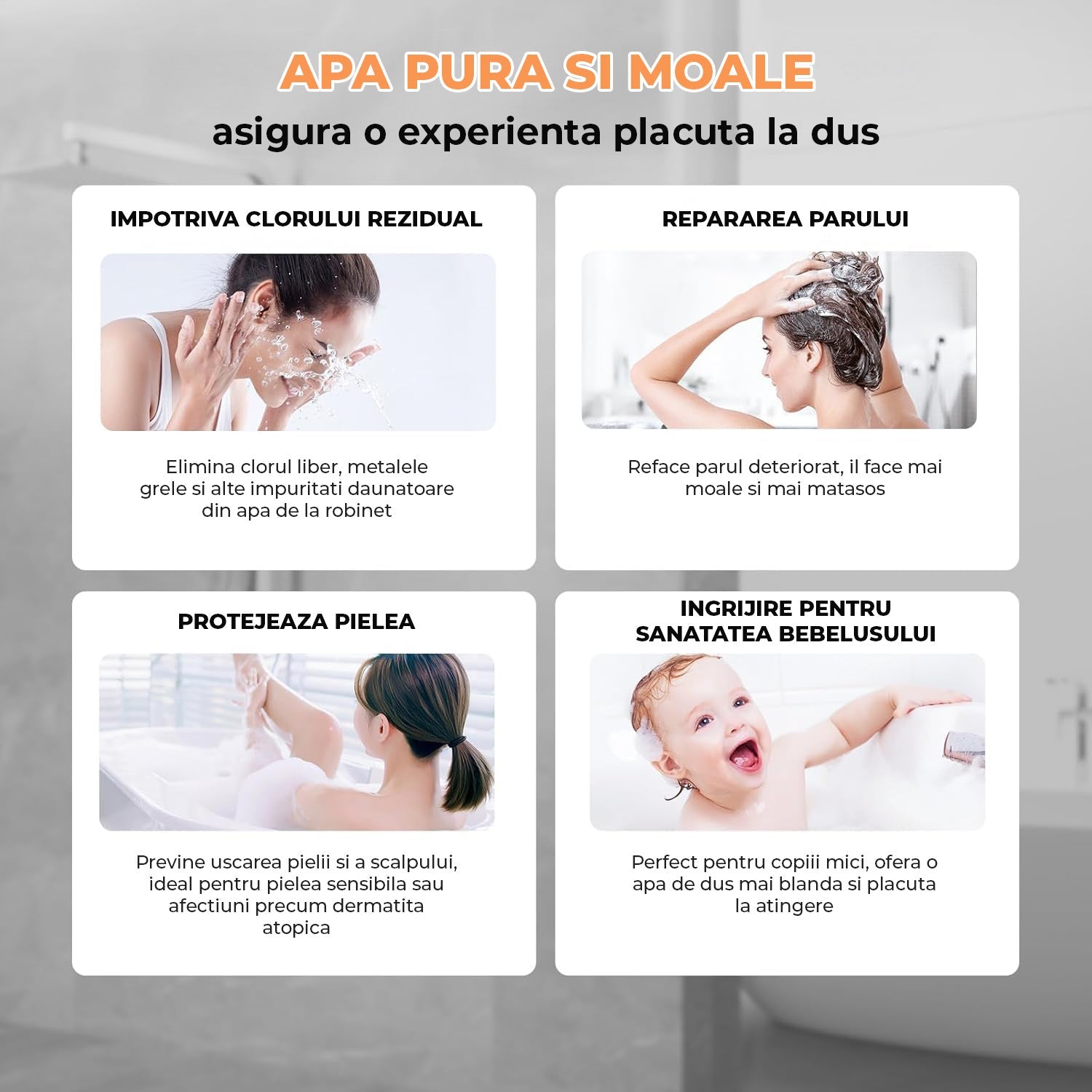 Fabricată din ABS cromat premium, para de duș asigură un jet puternic și constant chiar și la presiune scăzută. Cu un debit de 8,1 litri/minut, oferă o experiență de duș intensă și economică în același timp. Este ideală pentru întreaga familie, inclusiv pentru copii, femei și seniori.