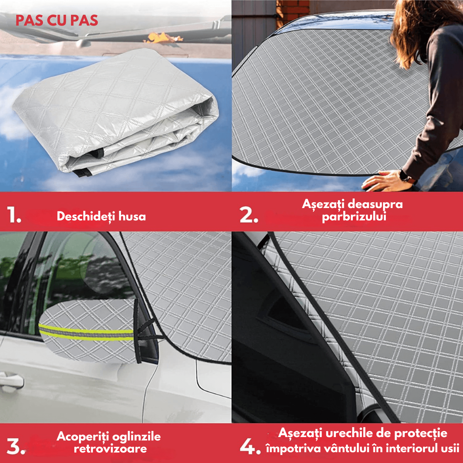 • Usor de instalat si de depozitat: Montarea acestui husei este simpla si rapida. Pur si simplu asaz-o pe parbriz si fixeaz-o cu ajutorul magnetilor puternici. Atunci cand nu este in utilizare, se poate plia si depozita cu usurinta in portbagajul masinii tale.