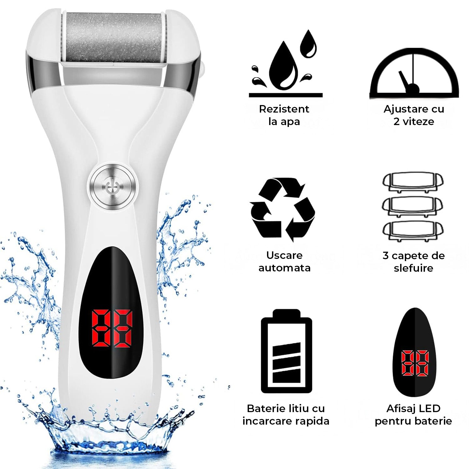 Pila Electrica Elindor® pentru Talpi si Calcaie, cu 3 Role de Slefuire, Display Digital, Rezistenta la Apa, Incarcare USB, 2 Viteze, Alb