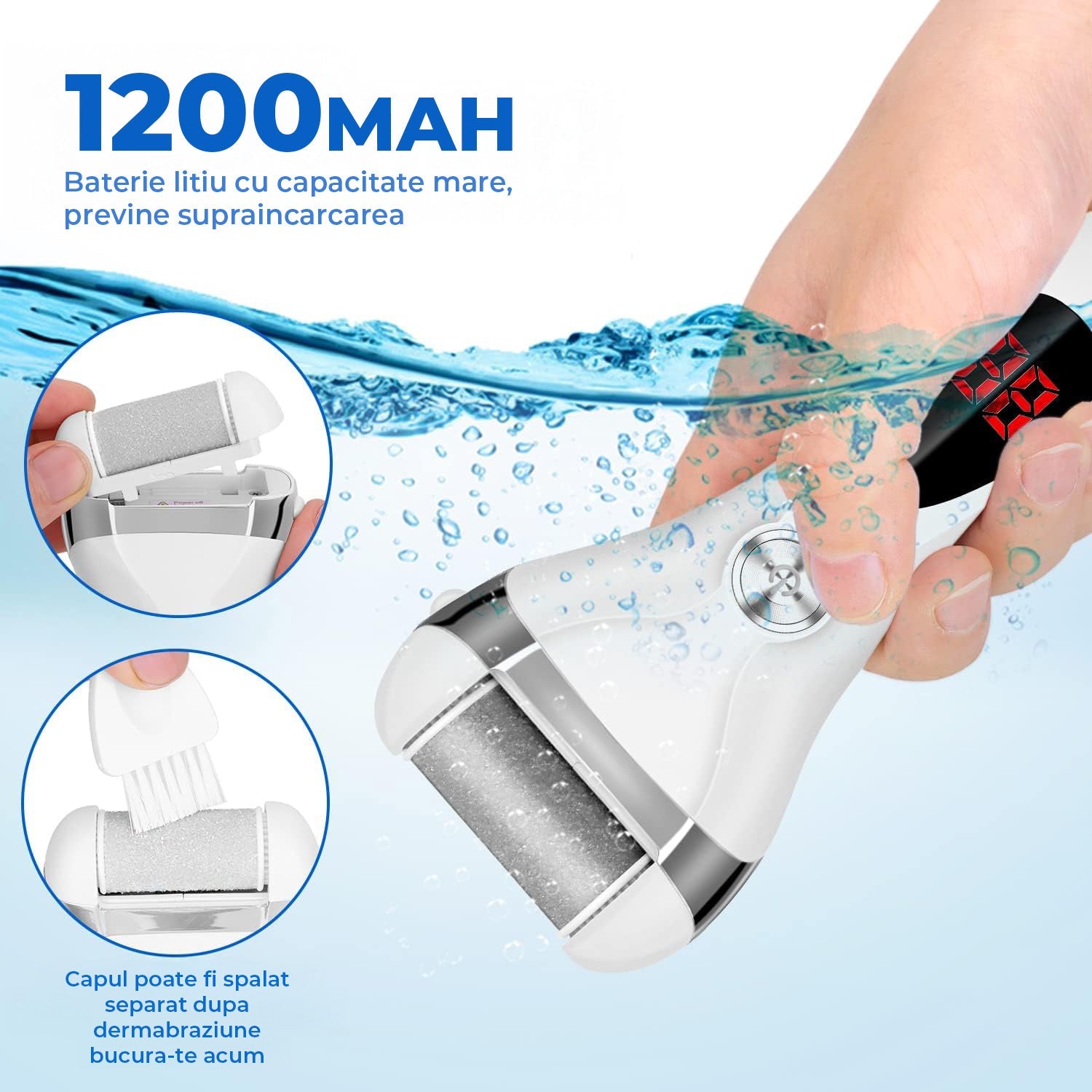 Dispozitivul functioneaza cu doua viteze – 1700 si 2000 de rotatii pe minut – astfel incat il poti adapta nevoilor tale, fie ca vrei sa indepartezi pielea uscata, bataturile dure sau calusurile adanci. Cu o baterie reincarcabila de 1200 mAh, pila poate fi folosita timp de pana la 90 de minute, iar afisajul digital iti arata nivelul bateriei in timp real. In plus, LED-ul incorporat lumineaza zona pe care o tratezi, pentru mai multa precizie.