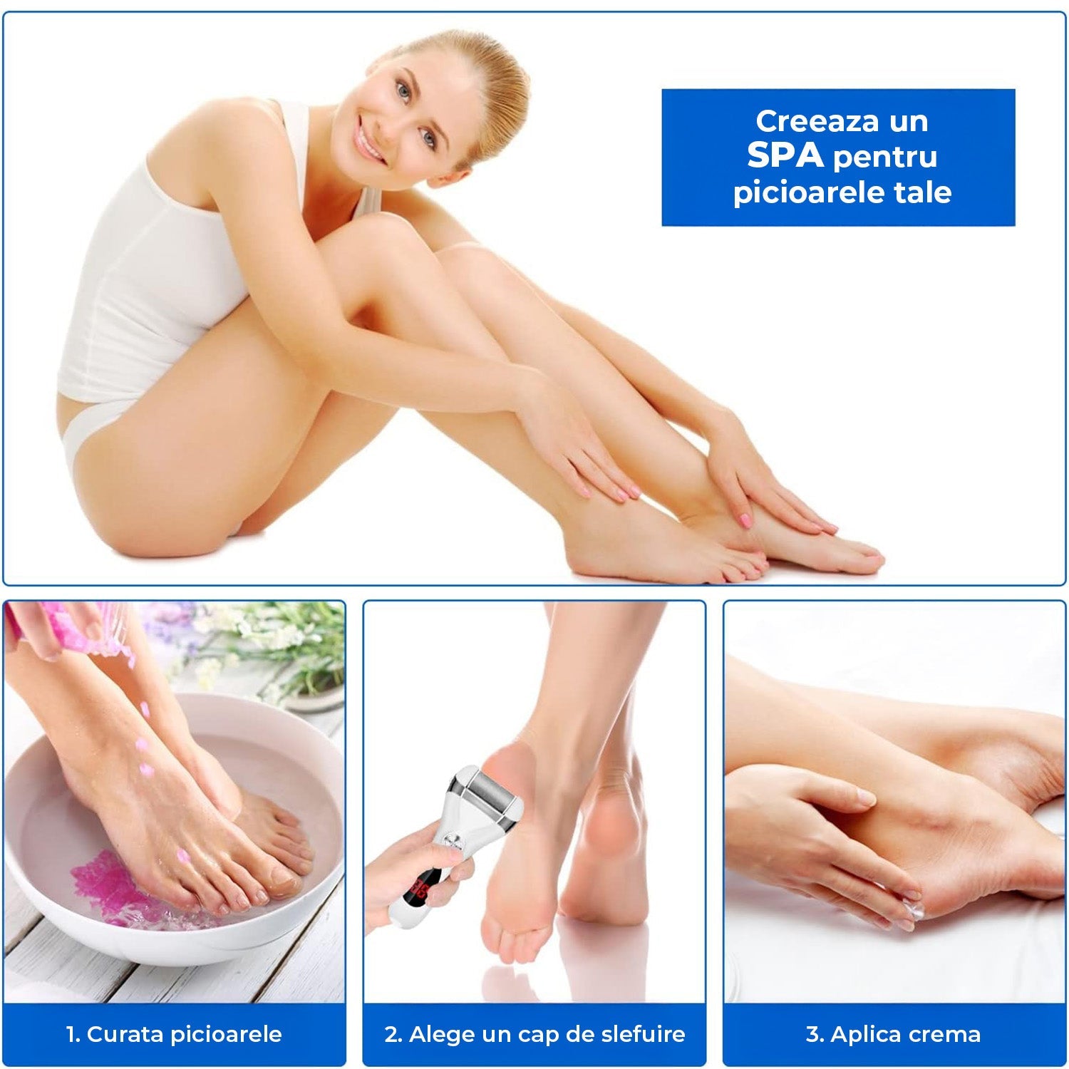 Transforma-ti rutina de ingrijire a picioarelor intr-o experienta de tip SPA, chiar in confortul casei tale. Acest set complet 8 in 1 iti ofera tot ce ai nevoie pentru o pedichiura impecabila: o pila electrica puternica, 3 capete de slefuire cu granulatii diferite (fina, medie si aspra), o perie de curatare, 2 pile manuale exfoliante si un cablu USB pentru incarcare rapida.