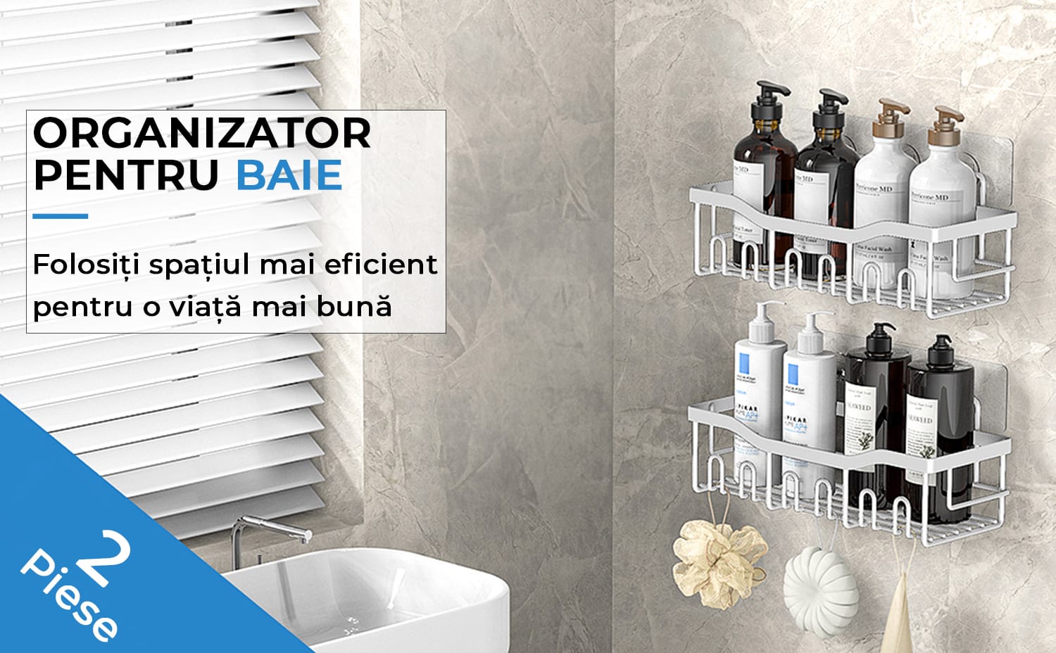 Set Organizator Dus cu 2 RafturiOrganizatorul pentru baie vine cu 2 rafturi, inclusiv si  2 adezivi. Ofera spatiu suficient pentru articolele de spalat sau condimente pentru gatit, valorificand spatiul la maxim si facilitandu-va viata. Ideal pentru organizarea baii/decorarea casei/depozitarea in bucatarie/organizarea si depozitarea rufelor/organizarea condimentelor/organizarea rafturilor de condimente/toaleta/rulote/apartament.