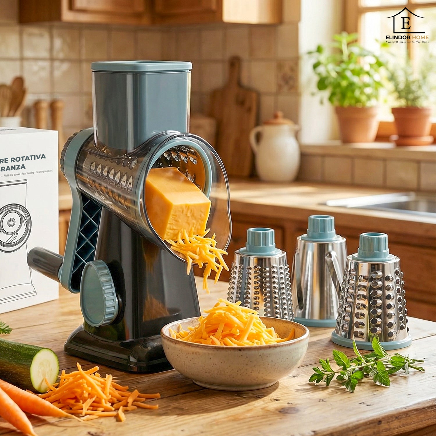 Rasnita si Feliator Legume Elindor® – Manuala, Tambur Rotativ, 3 Lame Interschimbabile, Maner cu Crank, Ventuza Stabilizare, ABS + Inox, Transparent (23 × 11 × 23 cm)