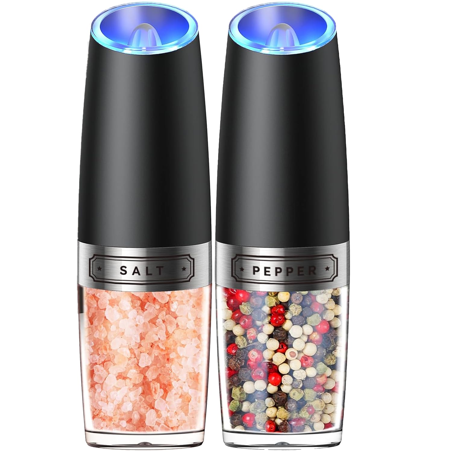 Rasnita Electrica pentru Sare si Piper, Set de 2, cu Camere de Depozitare Transparente, Reglare Grosime Macinare, LED, Senzor Gravitational, Operare cu o Mana, Negru